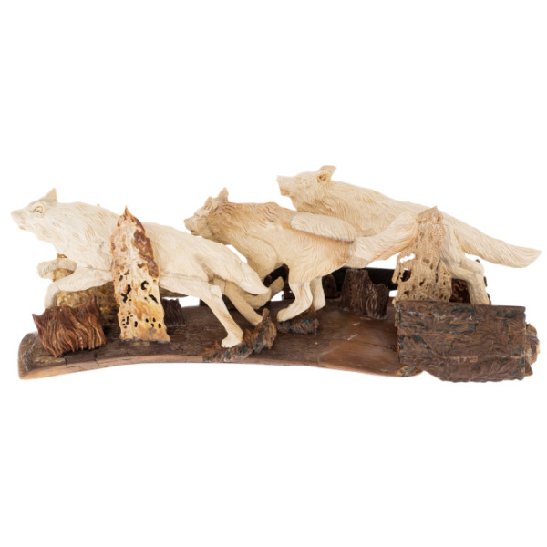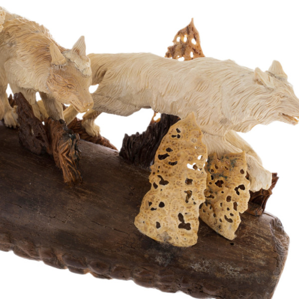 Композиция, созданная из бивня мамонта, представляет собой трех волков, бегущих сквозь дикий непроходимый лес. Каждая фигура проработана с изысканным вниманием к деталям: шерсть кажется живой, дышащей, она словно движется вместе с животными, повторяя каждую линию их тел. Эти могучие звери символизируют неукротимую силу, решимость и преданность, что делает их идеальными для владельца, который стремится подчеркнуть свои положение и статус.