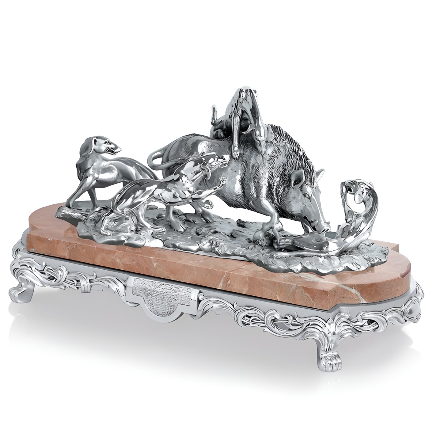 Скульптурная композиция «Охота на кабана» выполнена в блистательной технике художественного литья с последующим гальваническим покрытием, придающим поверхности благородный блеск старинного серебра. В центре сцены — разъярённый вепрь, с мощным напряжением мускулов, со взглядом, полным ярости и инстинктивной решимости. Его окружают борзые — стремительные, изваянные в движении, с вытянутыми корпусами и пастями, готовыми сомкнуться на добыче. Охотничьи сцены подобного масштаба издавна ценились как символ мужества, отваги и власти над природной стихией.