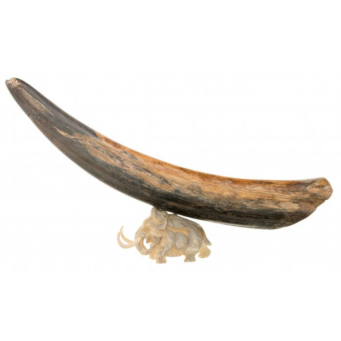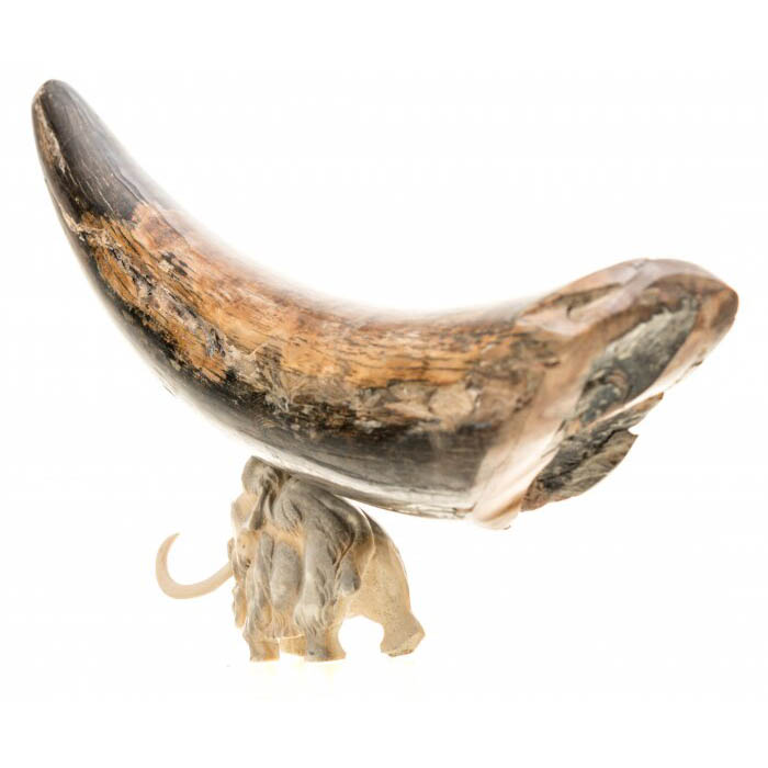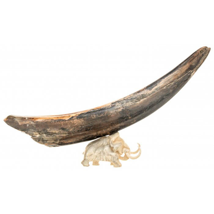 Монументальный арт-объект, воплощающий в себе древнюю мощь и безмолвную силу природы, — коллекционная композиция из натурального бивня мамонта, опирающаяся на резную фигурку самого доисторического великана. Естественная кривизна и массивная форма бивня сохранились в первозданном виде: поверхность покрыта сетью живых текстур, переходящих от угольно-темных до медово-светлых тонов. На скульптурном основании — одинокий мамонт, вырезанный вручную из более светлого фрагмента бивня, с тонко проработанными морщинами кожи, изогнутыми бивнями, прядями шерсти и взглядом, в котором читается первозданная сила. Он словно навечно замер в позе, поддерживая ту самую часть себя, уцелевшую сквозь тысячелетия.