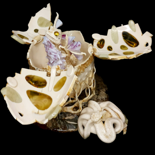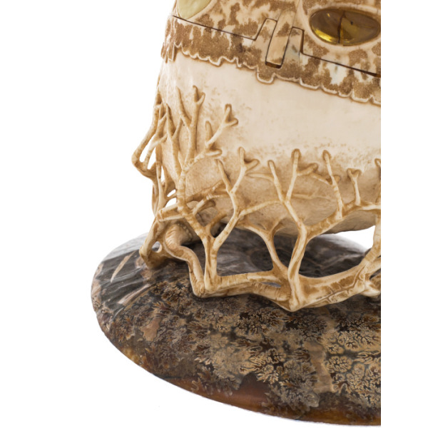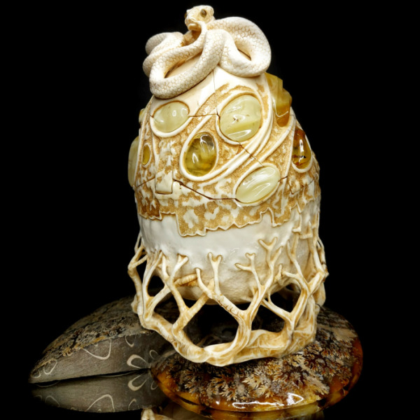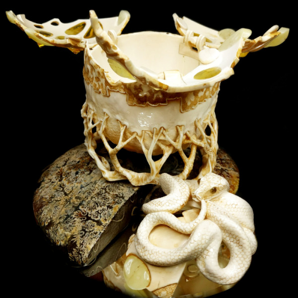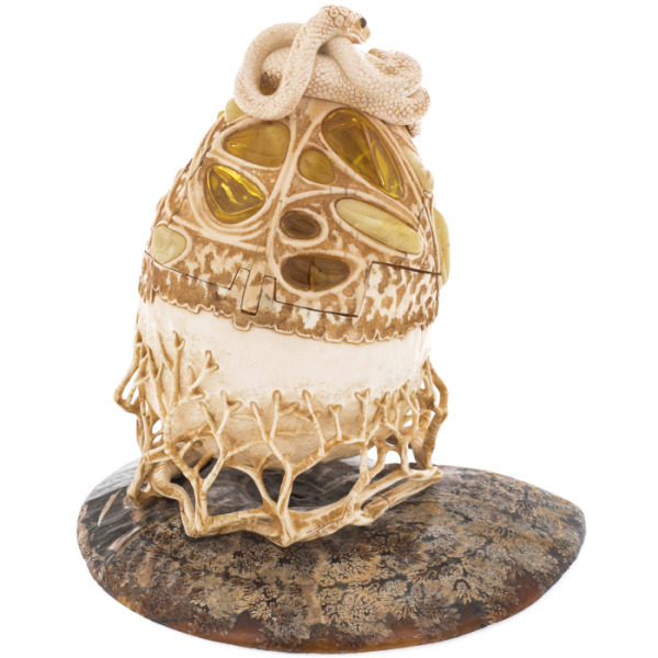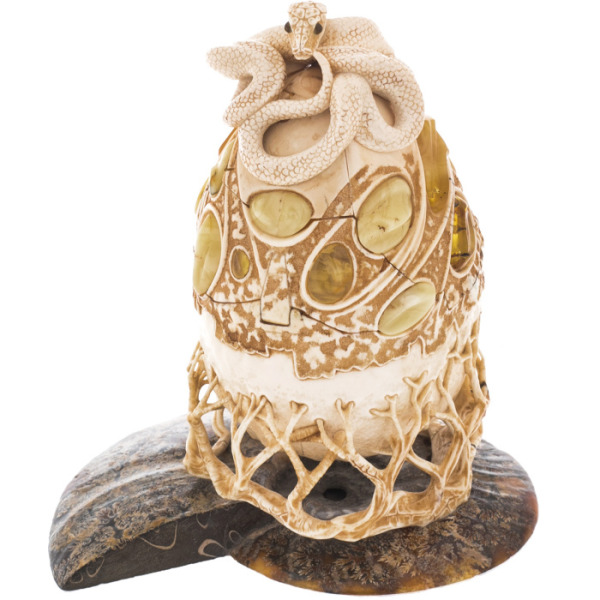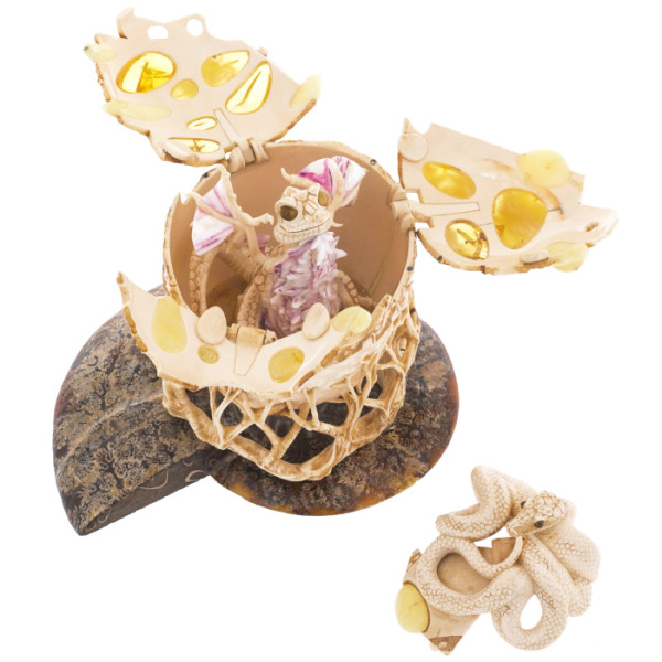Яйцо, символизирующее начало всего сущего, возлежит на спирали аммонита — окаменелости, являющейся свидетелем миллионов лет эволюции. Эта спираль, символ бесконечного цикла времени, создает основу для яйца, добавляя композиции глубину и историческую значимость. Венчает яйцо змея — древний символ мудрости и возрождения, витиевато обвившаяся вокруг него, словно защищая таинственную сущность, скрытую внутри.