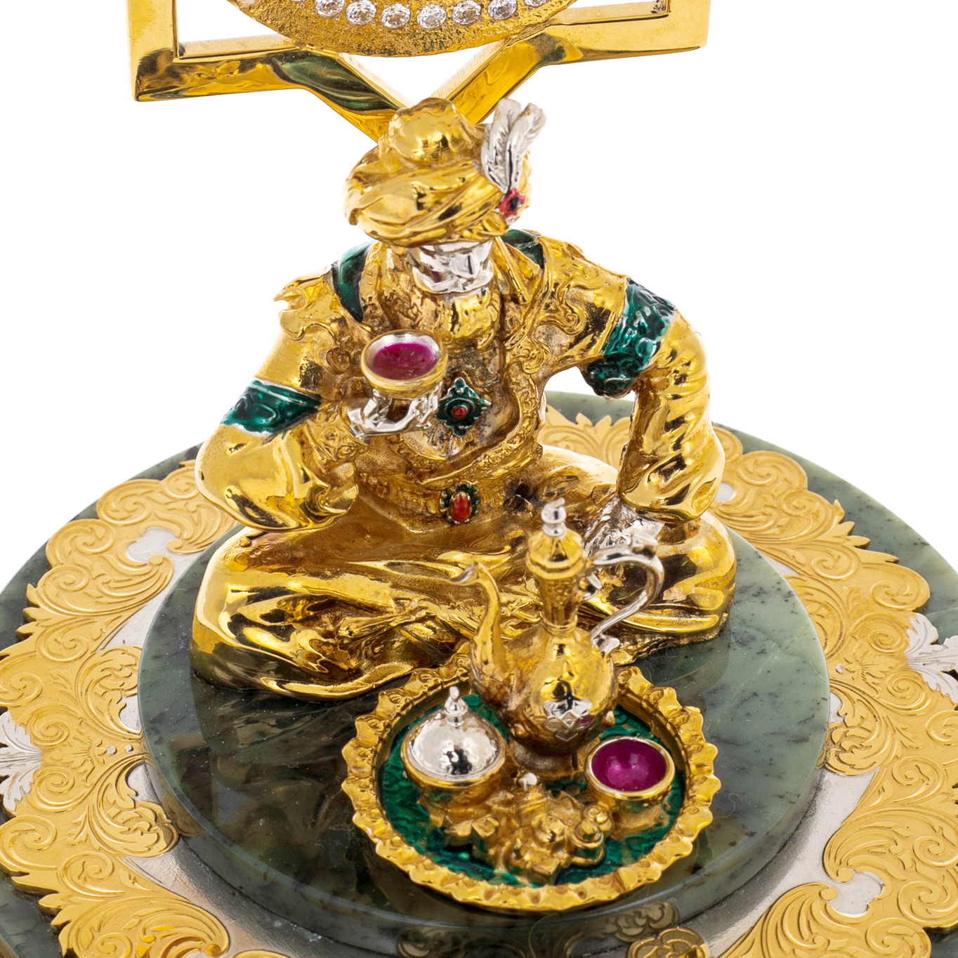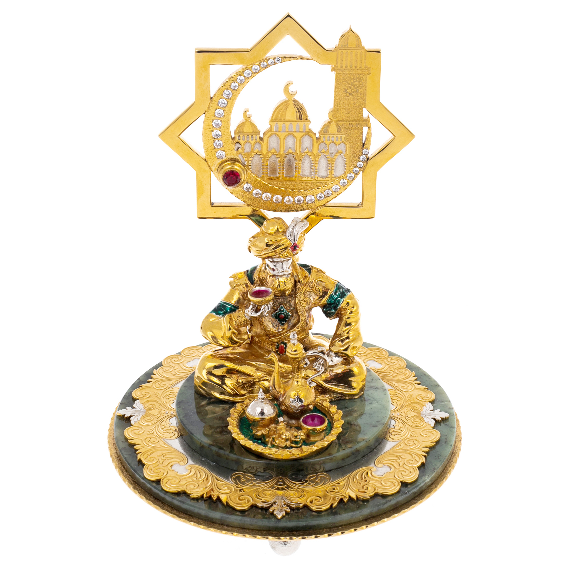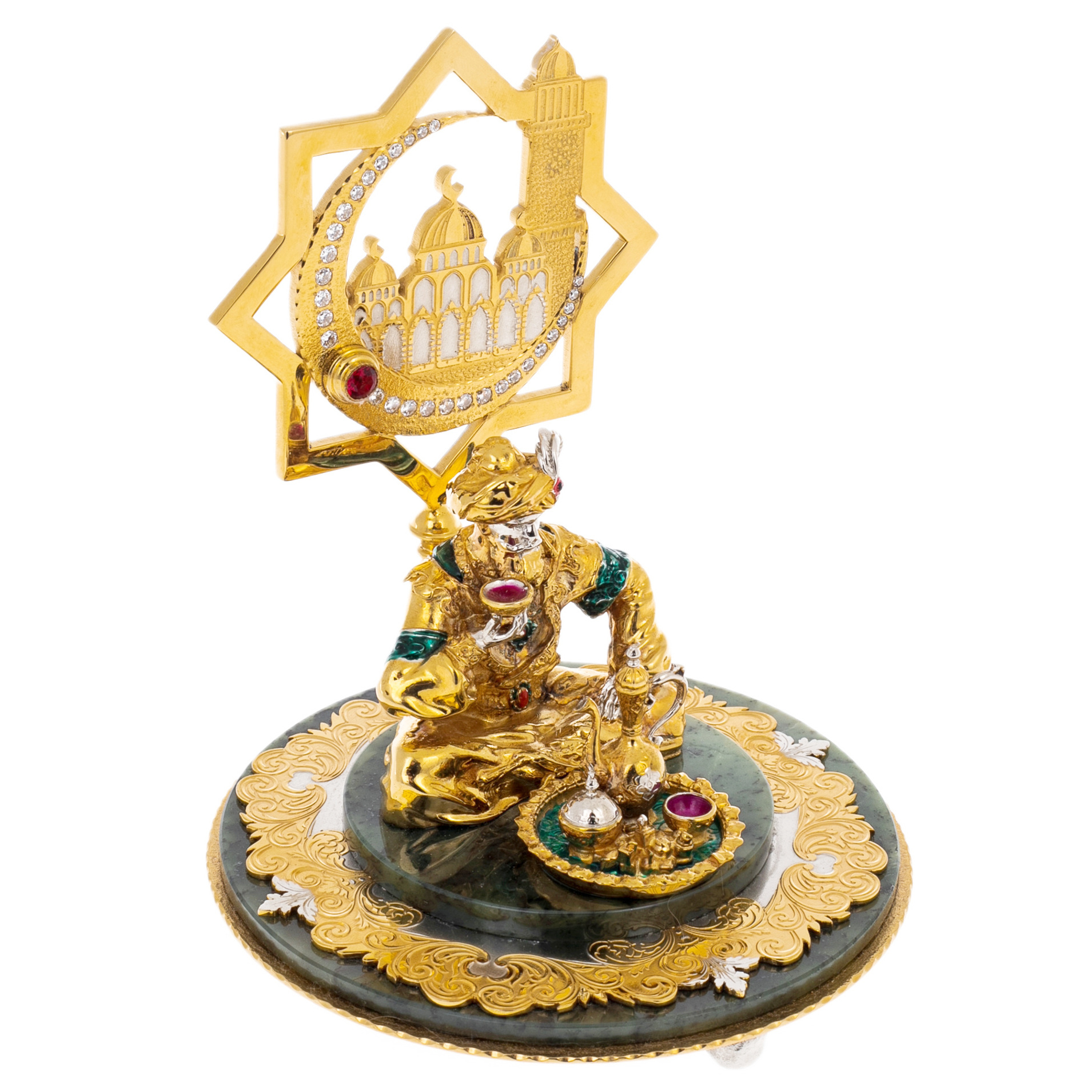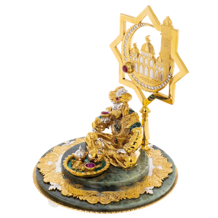 Вся композиция выполнена вручную из тончайшего фарфора, прошедшего многократный обжиг и расписанного яркими эмалевыми красками с применением золота и платиновых акцентов. Детали ожерелий, браслетов и пояска на бедре инкрустированы вручную, каждое украшение — будто артефакт далёкой цивилизации. Кувшин, сжатый в её руке, оформлен в виде драгоценной капсулы, сверкающей переливами рубинового, лазурного и изумрудного оттенков. Пальмовые листья над головой образуют обрамление, словно оберегающее героиню от зноя и глаз внешнего мира. На подставке — классический фарфоровый бордюр с ручной росписью и тонкой жемчужной фактурой.