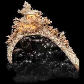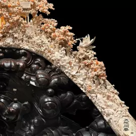 Из бурлящих волн, искусно вырезанных в тёмном основании, поднимается гора долголетия — образ мифической небесной обители. Её склоны покрыты цветущими персиковыми деревьями, соснами и кипарисами, которые в китайской символике означают долгую жизнь, устойчивость и вечность. Цветы и ветви образуют сложный орнамент, в котором природный мир соединяется с миром божественным.