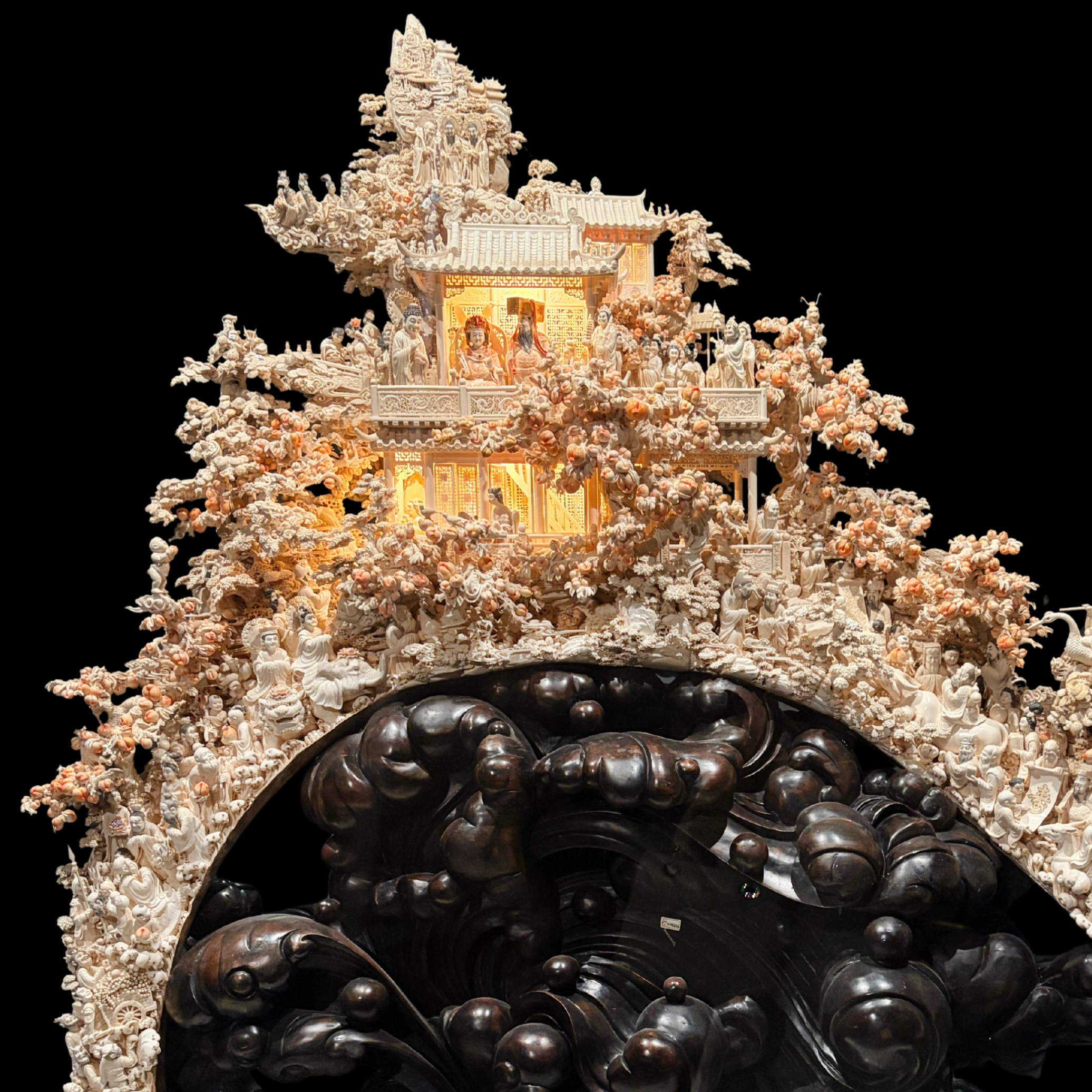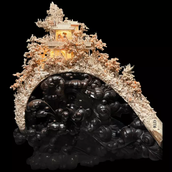 Композиция из бивня мамонта «Небо и Земля в единой весне» представляет собой грандиозное произведение художественной резьбы, вдохновлённое одной из самых известных сцен китайской мифологической литературы — Праздником персиков бессмертия из классического романа «Путешествие на Запад». Скульптура создана из бивня мамонта, пролежавшего во льдах около десяти тысяч лет, и воплощает древнюю философскую идею гармонии небесного и земного мира.