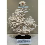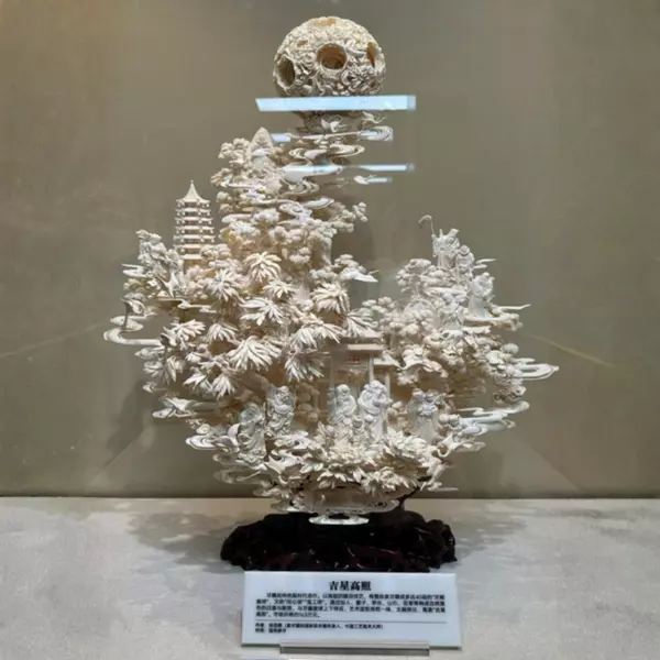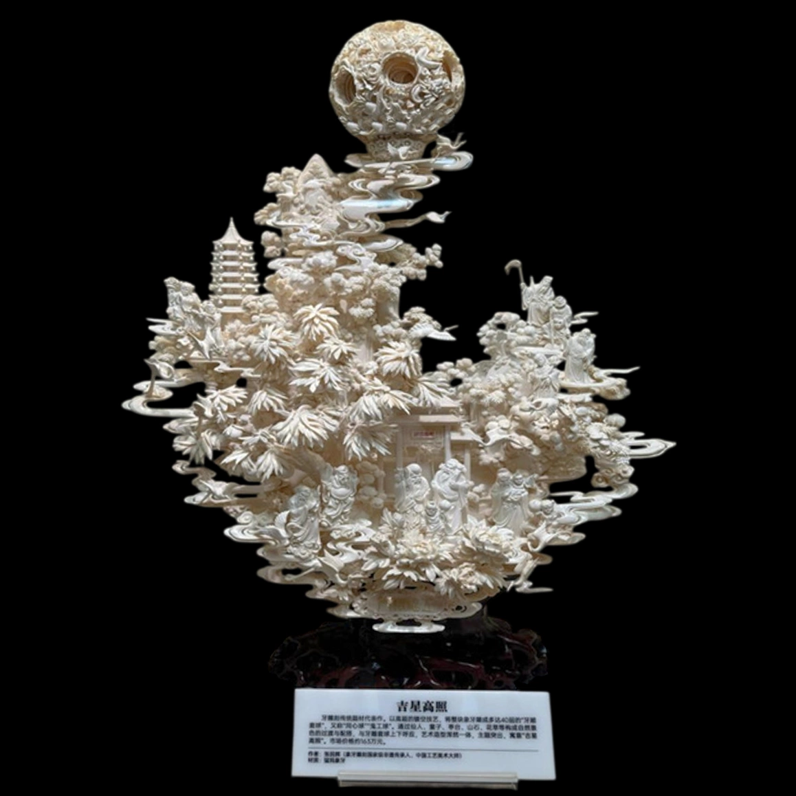 Венчающий композицию ажурный кантонский шар символизирует небесное светило — ту самую счастливую звезду, чьё сияние нисходит на земной мир. Ниже разворачивается сложный многоуровневый пейзаж: пагода, горные вершины, облачные завитки, пышная растительность и фигуры мудрецов, пребывающих в гармонии с природой. Облака словно струятся вокруг центральной сферы, соединяя небо и землю, а тщательно вырезанные персонажи образуют философскую сцену созерцания и благополучия.