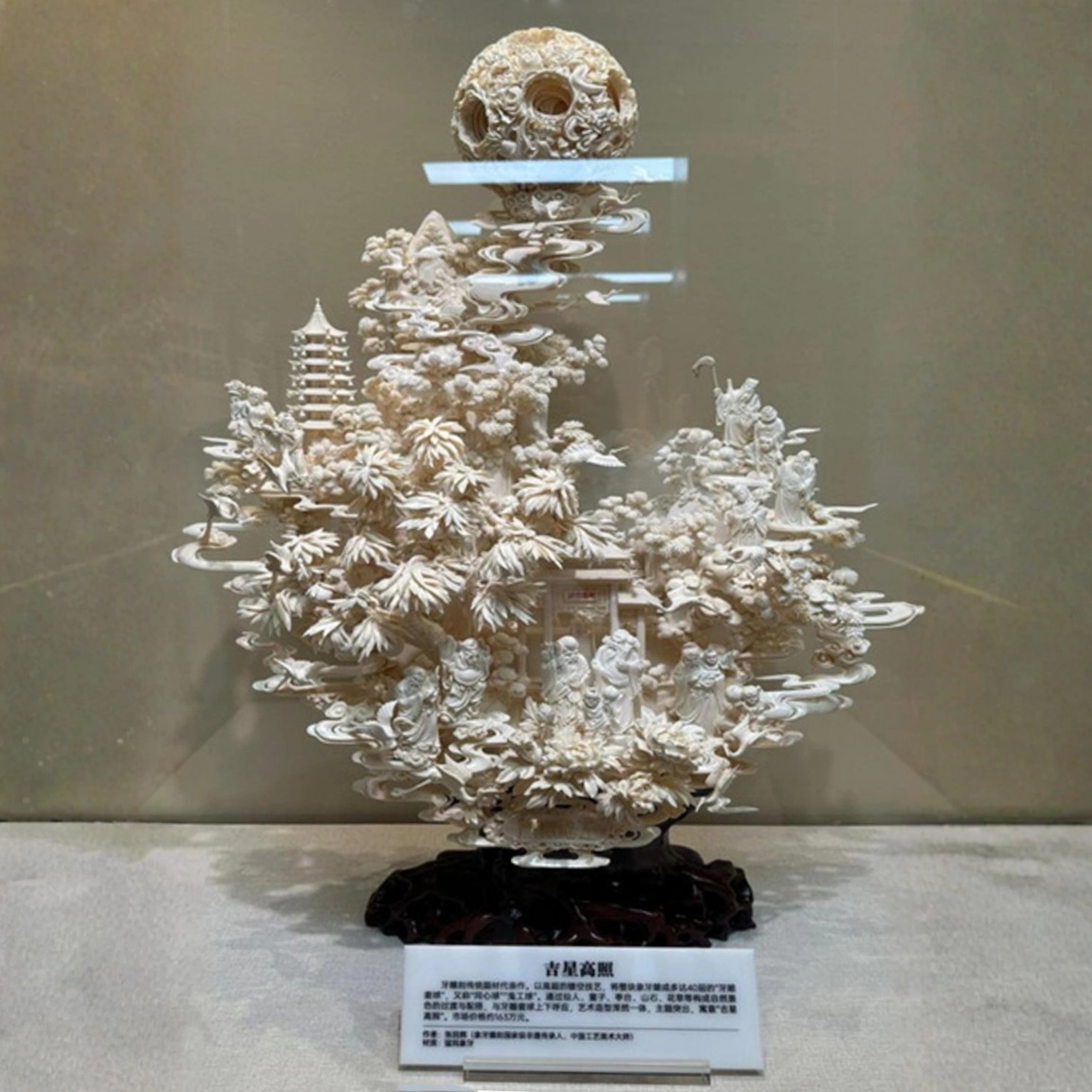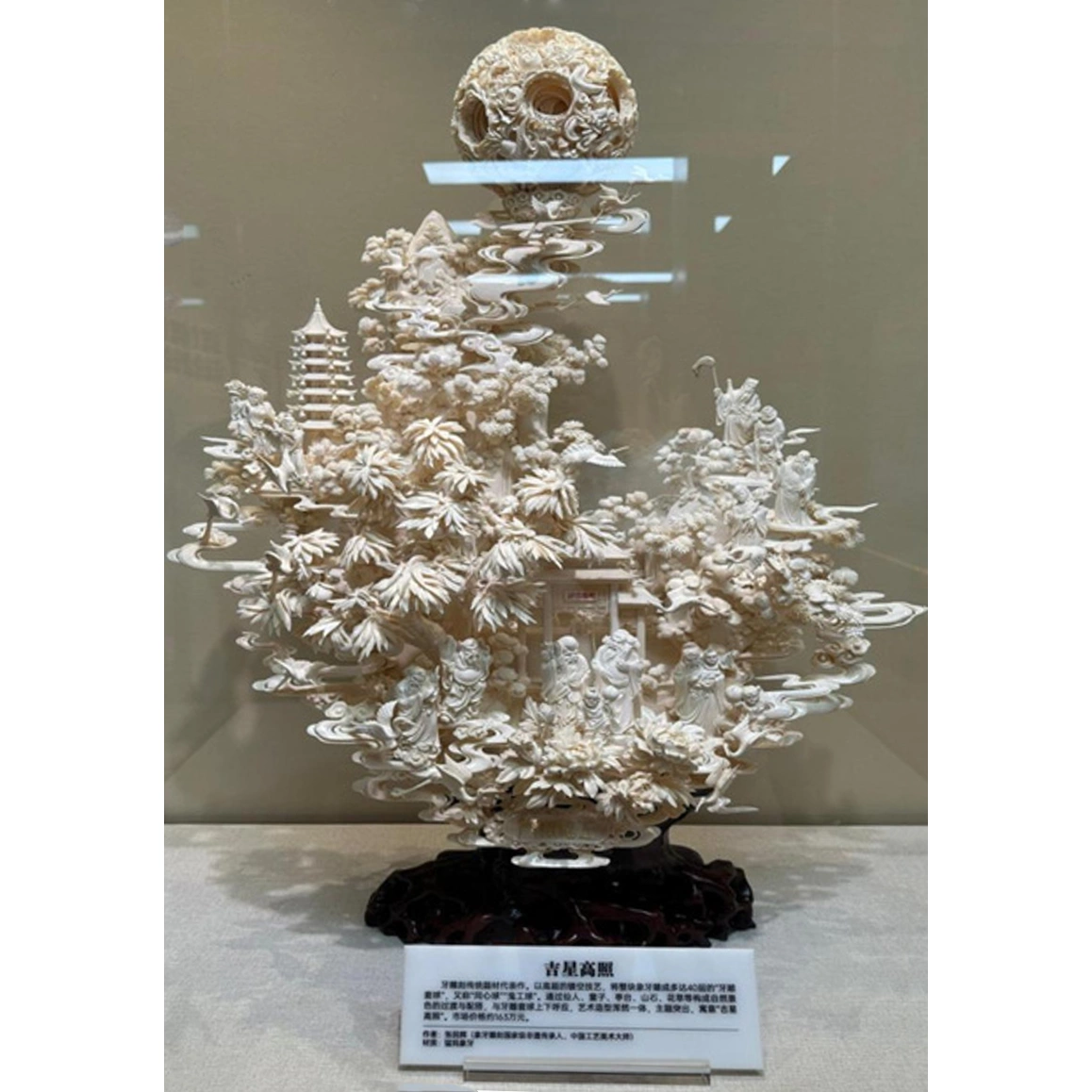 Таким образом, название неразрывно связано с художественным образом композиции. Небесная сфера символизирует высшее благословение, а земной мир под ней — пространство, озарённое удачей и гармонией. «Цзисин Гао Чжао» — это не просто декоративная скульптура, а пластическое воплощение пожелания счастья, процветания и светлого пути, выраженное в виртуозной резьбе по бивню мамонта.