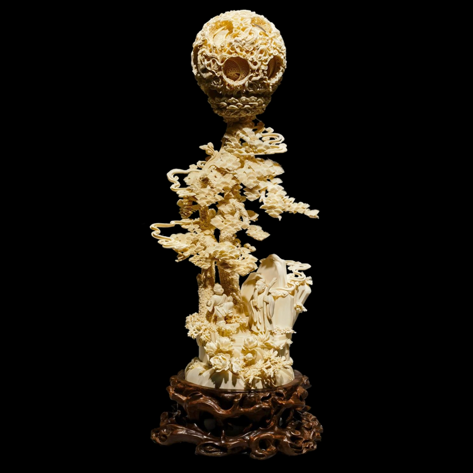 Кантонский шар из слоновой кости, известный также как «призрачный шар», — один из наиболее характерных видов гуанчжоуской резьбы, сформировавшийся ещё в эпоху династии Мин. Его уникальность заключается в том, что цельный фрагмент кости выдалбливается в многослойную сферу с переплетающимися ажурными оболочками. Каждый слой тонко проработан собственным сквозным орнаментом и может свободно вращаться внутри последующего, создавая впечатление лёгкости и почти невесомой прозрачности.