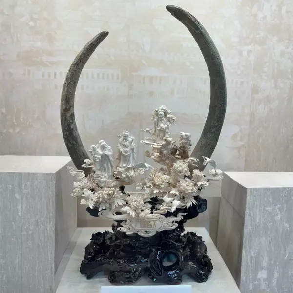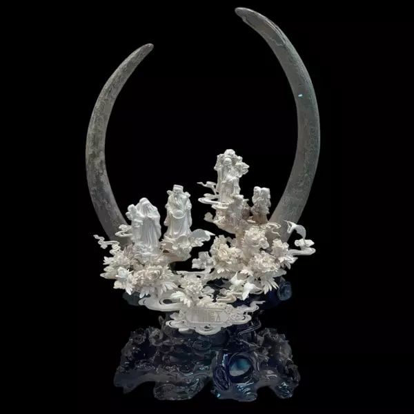 Два изогнутых бивня образуют величественную арку, напоминающую небесный свод или символический круг времени. Внутри этого пространства размещены фигуры почтенных старцев — воплощение мудрости, опыта и преемственности учения. Их позы спокойны и сосредоточены, складки одежд текут мягкими линиями, лица исполнены достоинства. Вокруг разворачивается декоративная среда — цветущие пионы, облачные завитки, журавли, традиционно символизирующие долголетие и возвышенность духа. Многоуровневая пластика создаёт ощущение движения и лёгкости, несмотря на сложность и плотность резьбы.