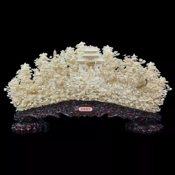 Творческий замысел: благодаря изысканному мастерству резьбы по кости и использованию бивня мамонта в качестве основы произведение раскрывает торжественную сцену, в которой Бог богатства преподносит сокровища Нефритовому императору, выражая благопожелание счастья и процветания. Композиция наполнена символами достатка и небесного покровительства.