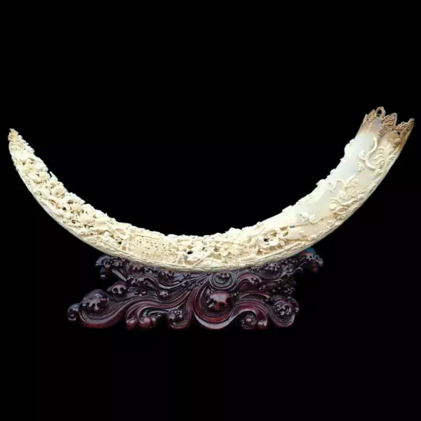 На водной глади распускаются цветы лотоса, в глубине играют косяки рыб, у кромки воды замерли внимательные цапли. Вся сцена наполнена живой динамикой и естественностью. Мастер виртуозно использует цельный бивень мамонта, раскрывая его пластические возможности и превращая природный материал в выразительное художественное произведение.