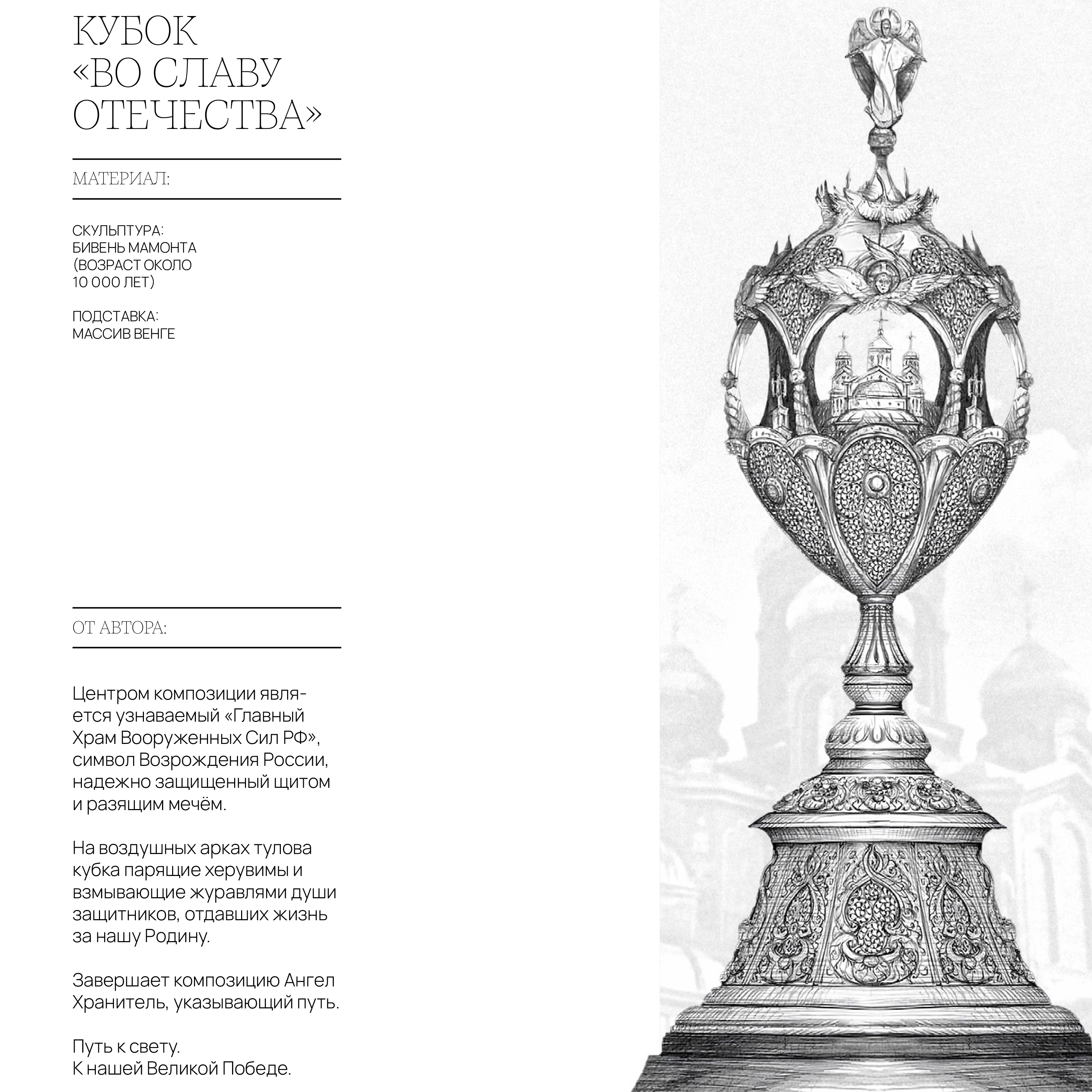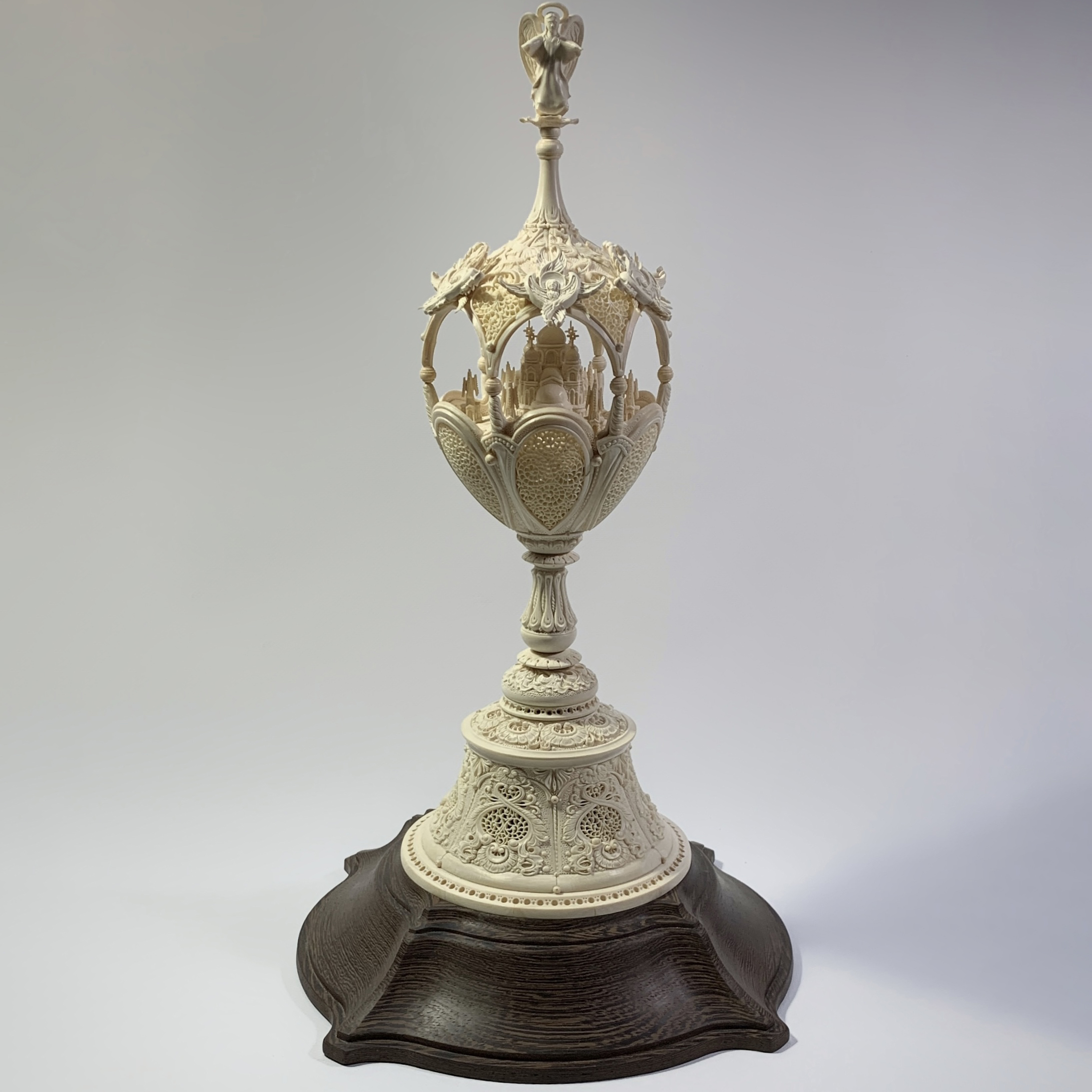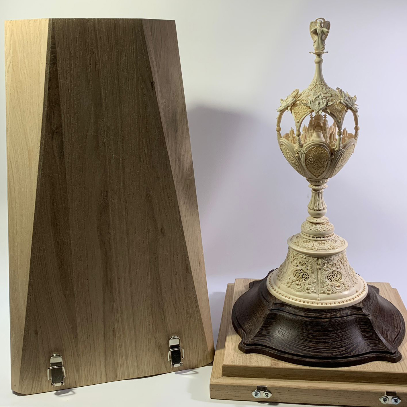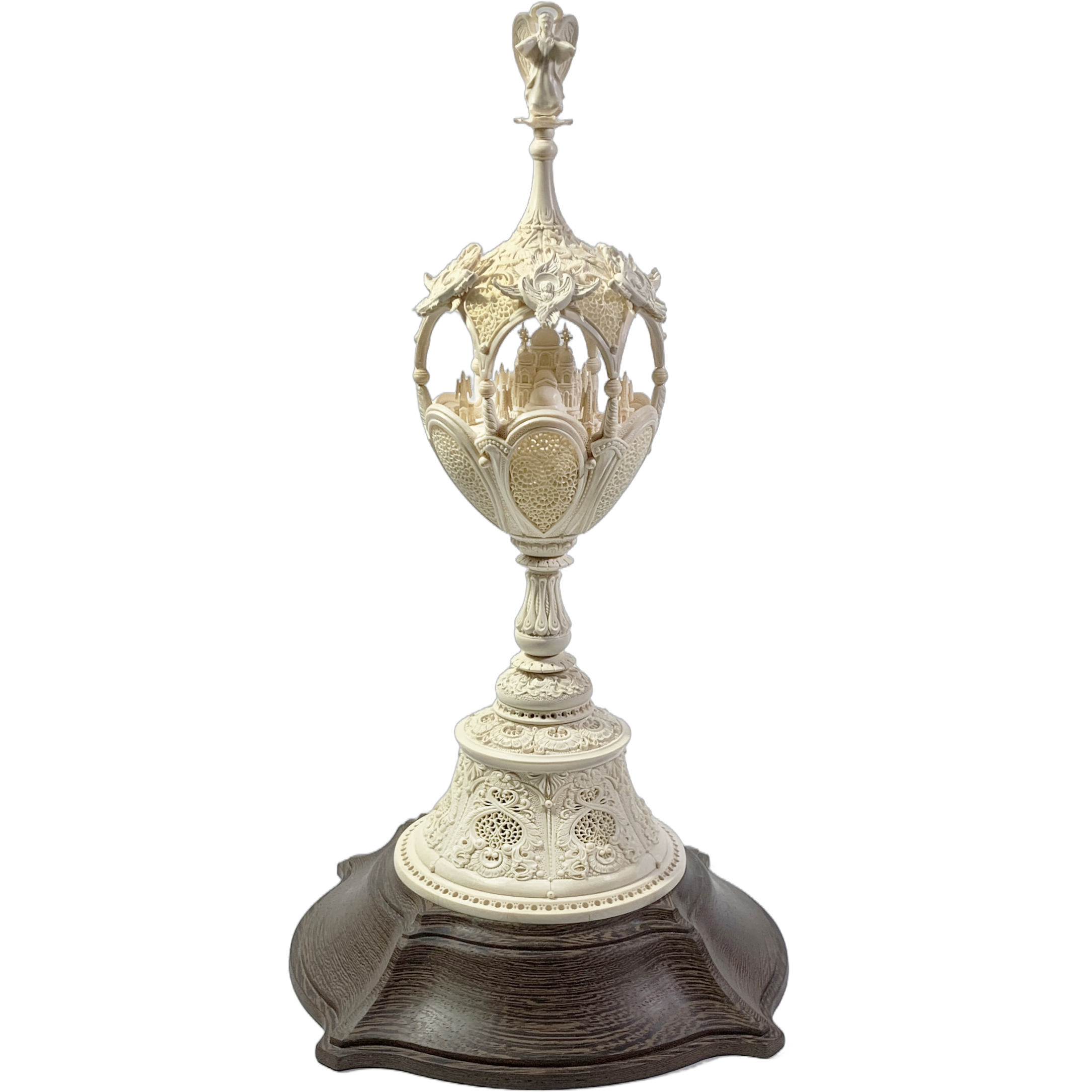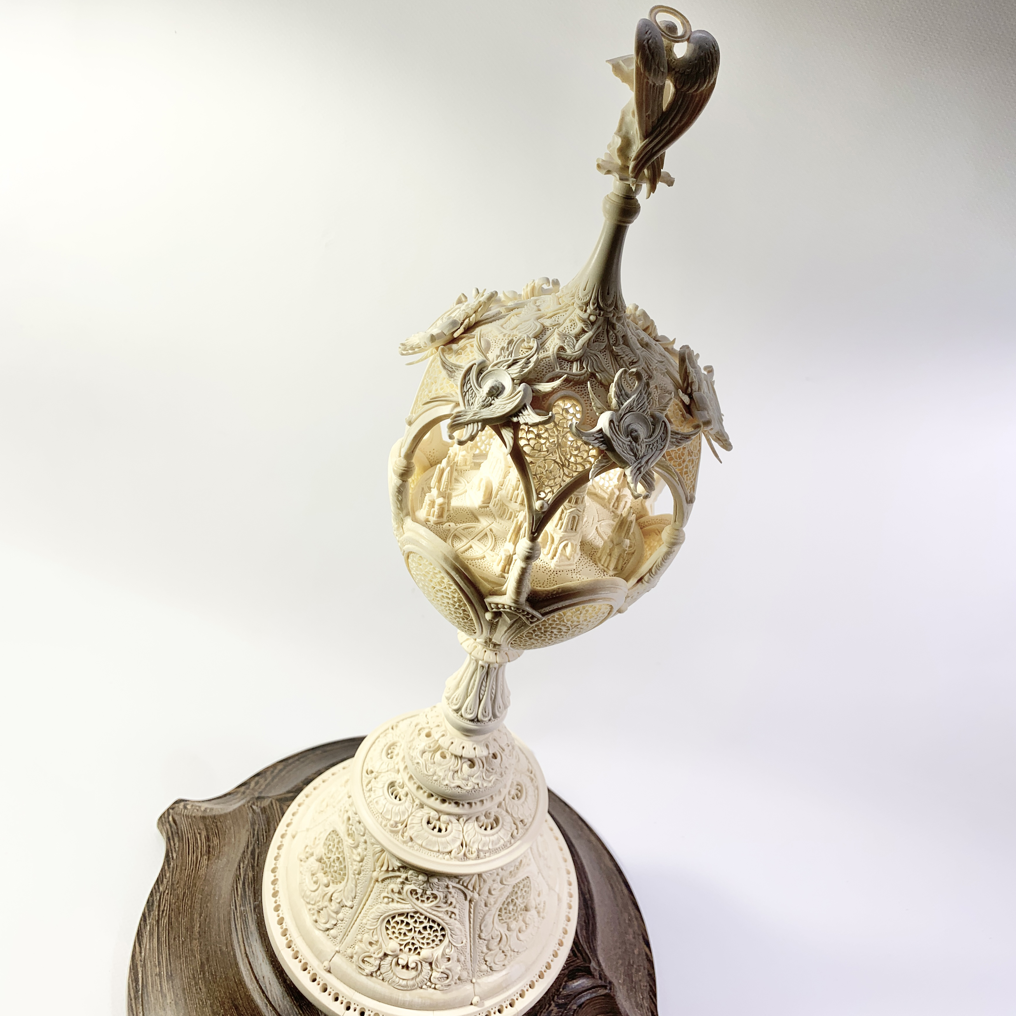 «Кубок во славу Отечества» — изысканная резная композиция, выполненная из редкого мамонтового бивня. В центре скульптуры — миниатюрный город, словно парящий внутри ажурного купола. Тончайшая резьба передает каждую деталь: купола и башни, арки и стены создают образ древнего величия. Верхняя часть украшена лепестками, словно цветы распускаются вокруг этого символического сооружения. Венчает композицию фигурка ангела, возвышающаяся над кубком и придающая ему дополнительный смысл — покровительство, защиту и вечную память.