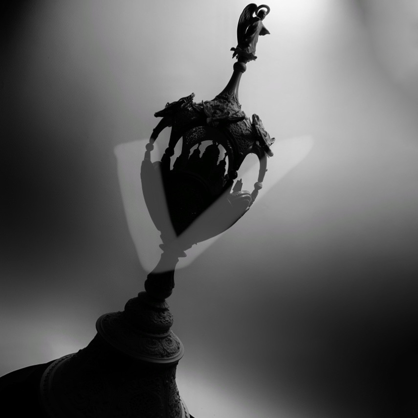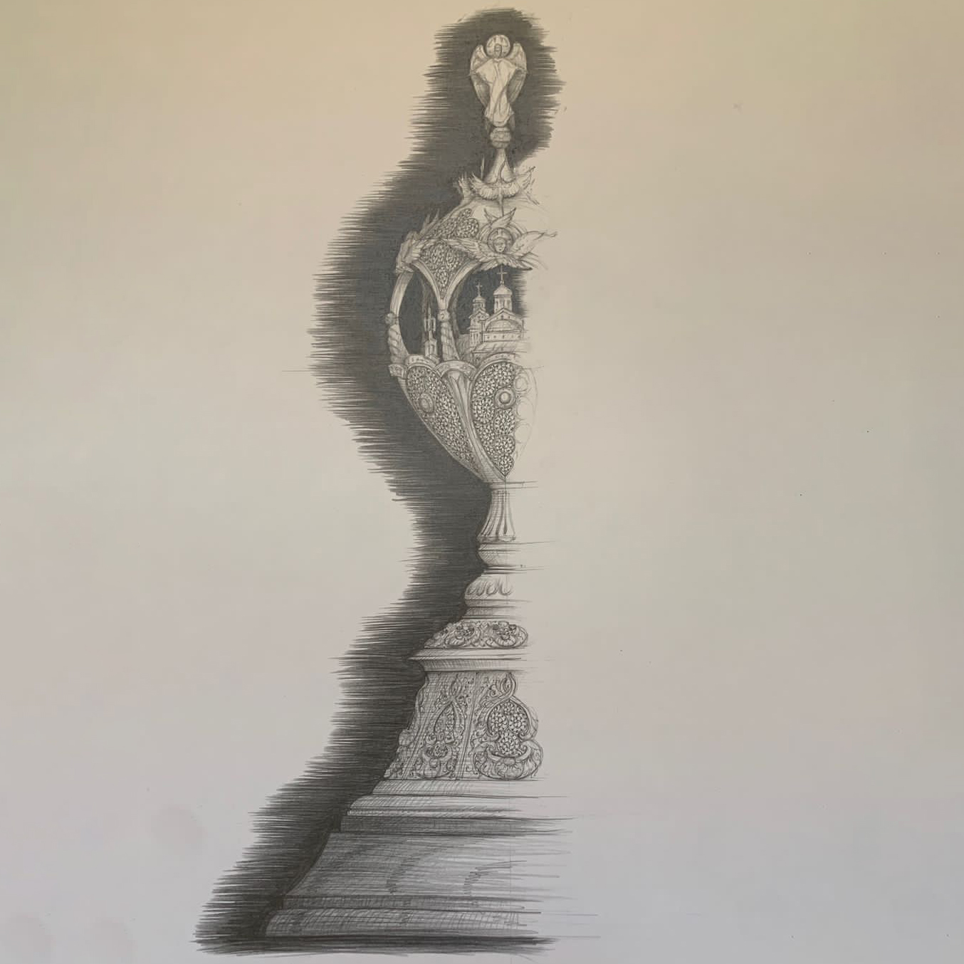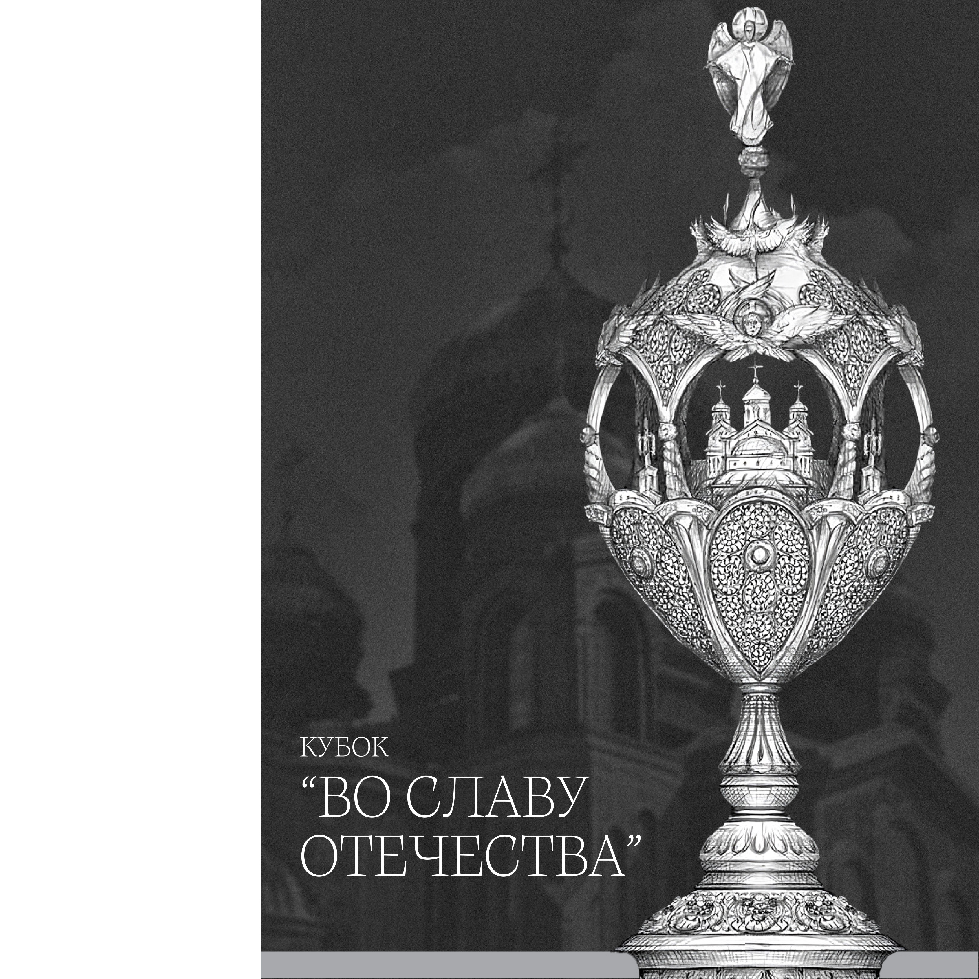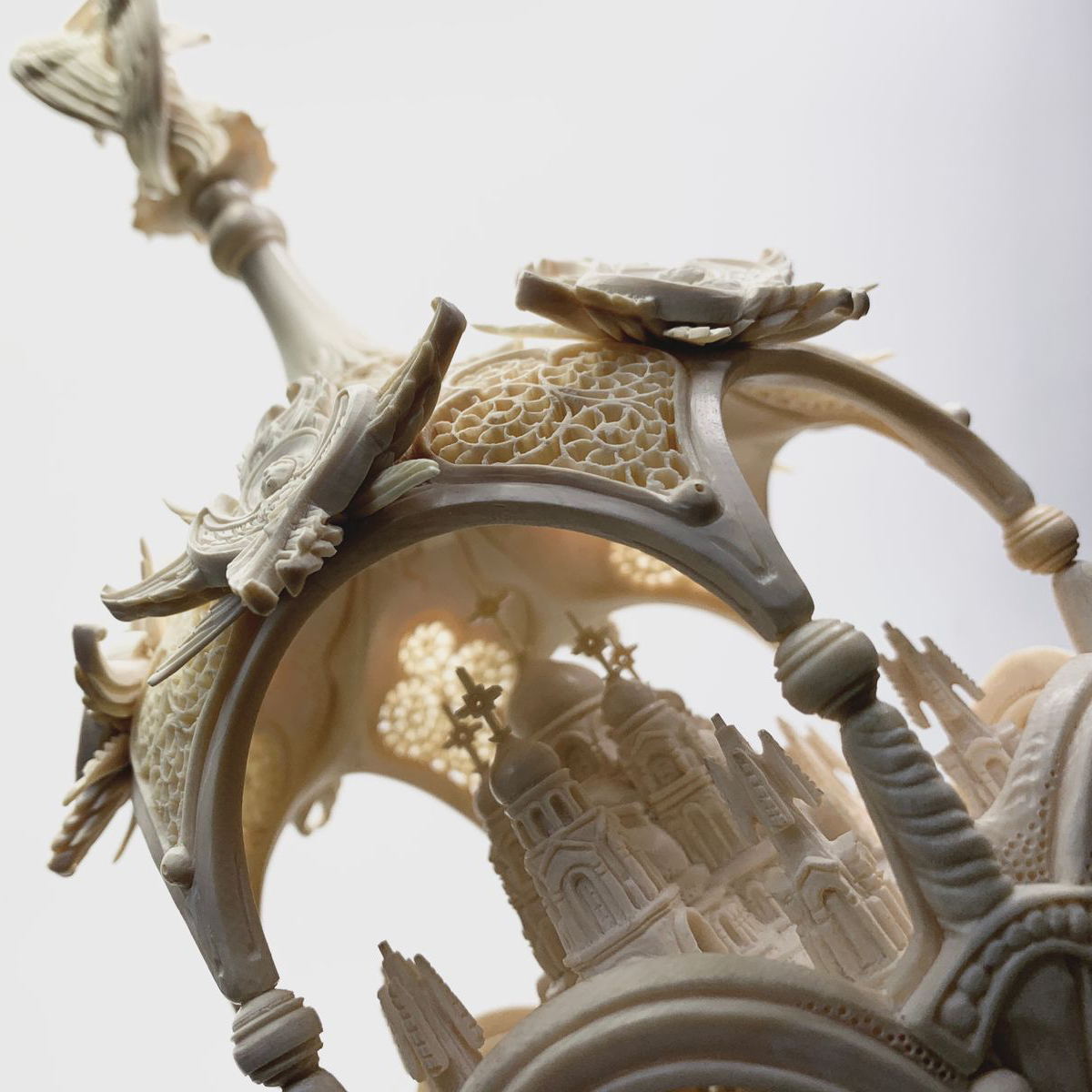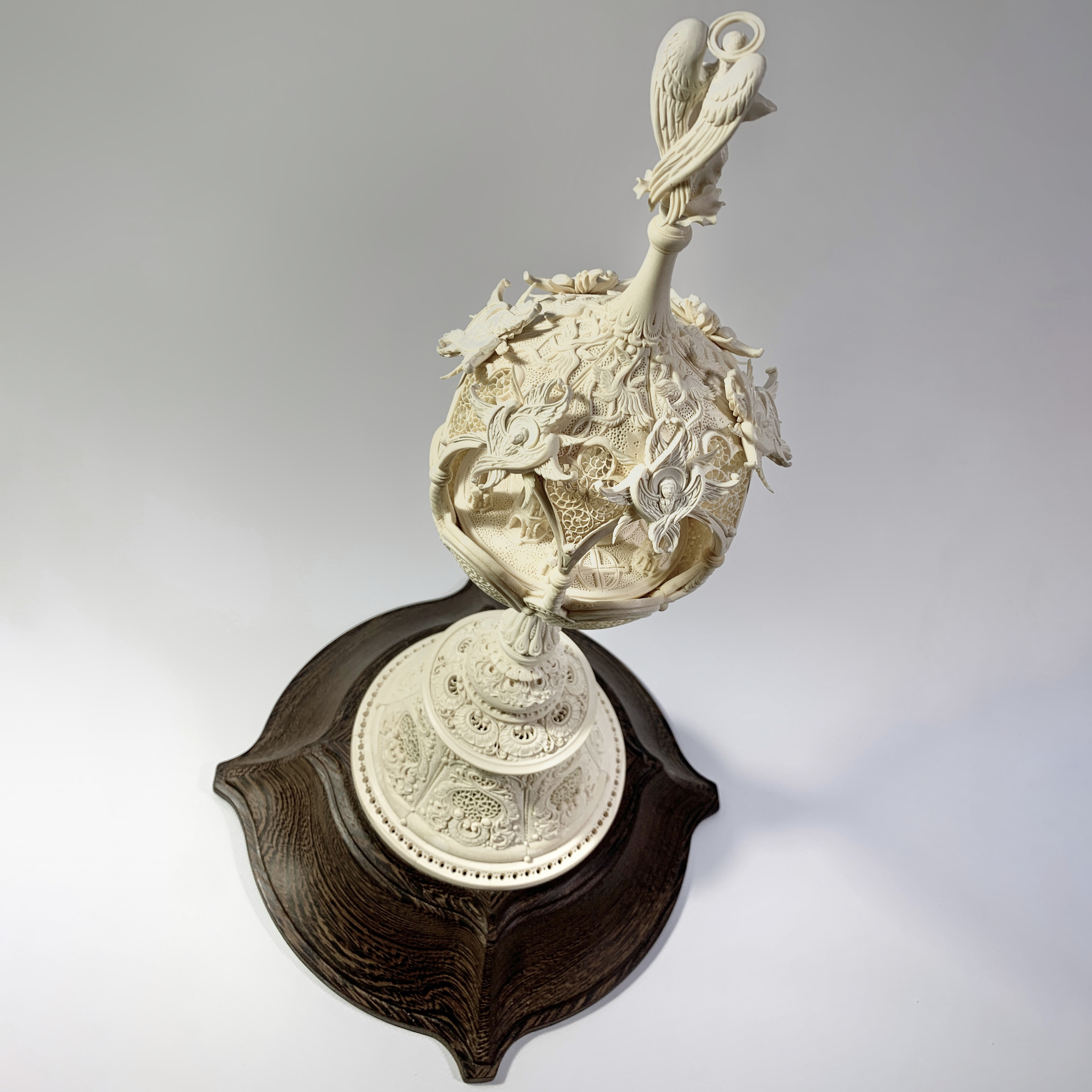 «Кубок во славу Отечества» — изысканная резная композиция, выполненная из редкого мамонтового бивня. В центре скульптуры — миниатюрный город, словно парящий внутри ажурного купола. Тончайшая резьба передает каждую деталь: купола и башни, арки и стены создают образ древнего величия. Верхняя часть украшена лепестками, словно цветы распускаются вокруг этого символического сооружения. Венчает композицию фигурка ангела, возвышающаяся над кубком и придающая ему дополнительный смысл — покровительство, защиту и вечную память.
