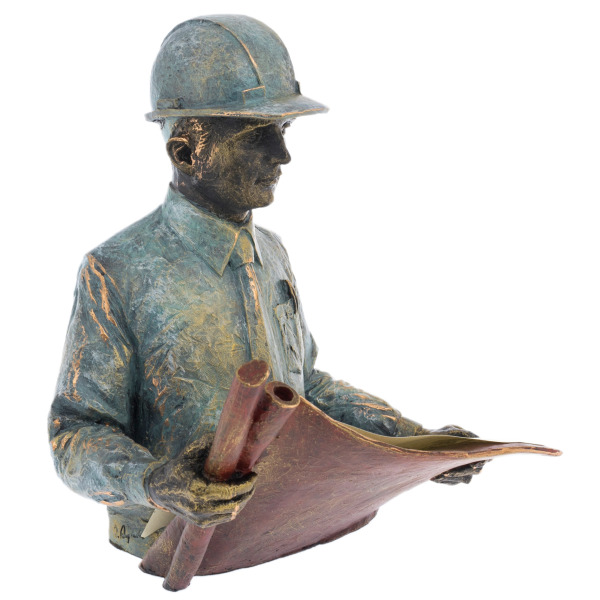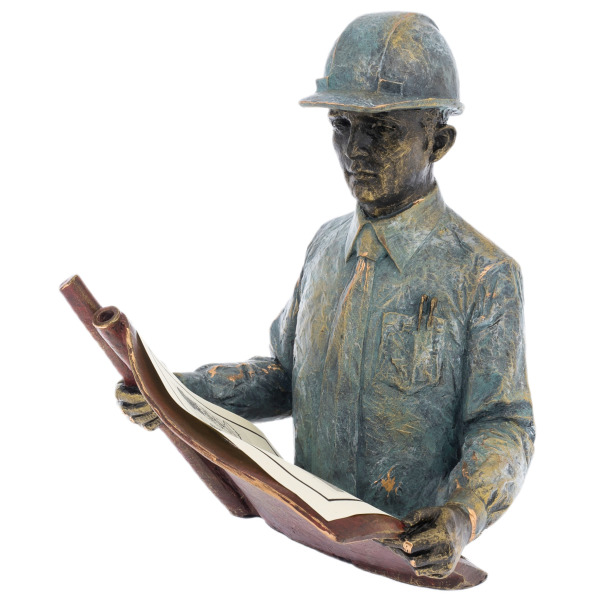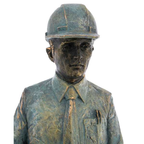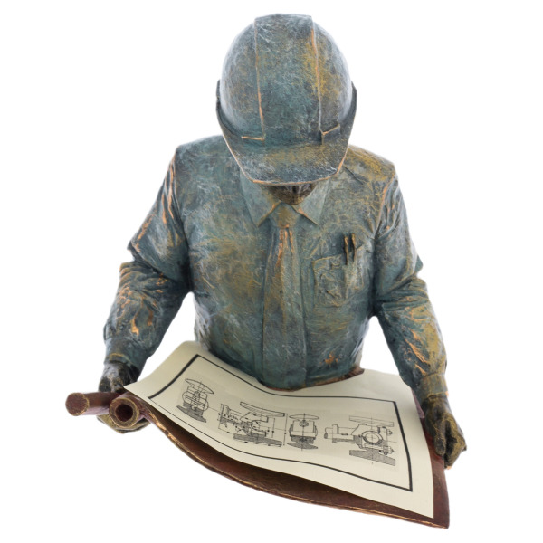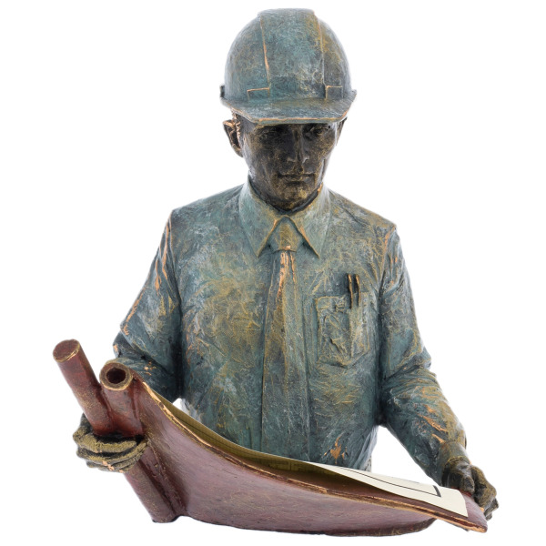 Каждая деталь фигуры передаёт весомость момента: строгий костюм оттенён патинированной бронзой, где сквозь глубокие переливы металла проступает игра света, намекающая на закатное солнце, скользящее по стенам еще невоплощённых шедевров. Тонко вычерченные карманы, в которых покоятся карандаши – инструменты, способные одним движением изменить облик мегаполисов. Надёжно сжатый в ладони рулон свитков напоминает о древних пергаментах, в которых запечатлены великие замыслы.