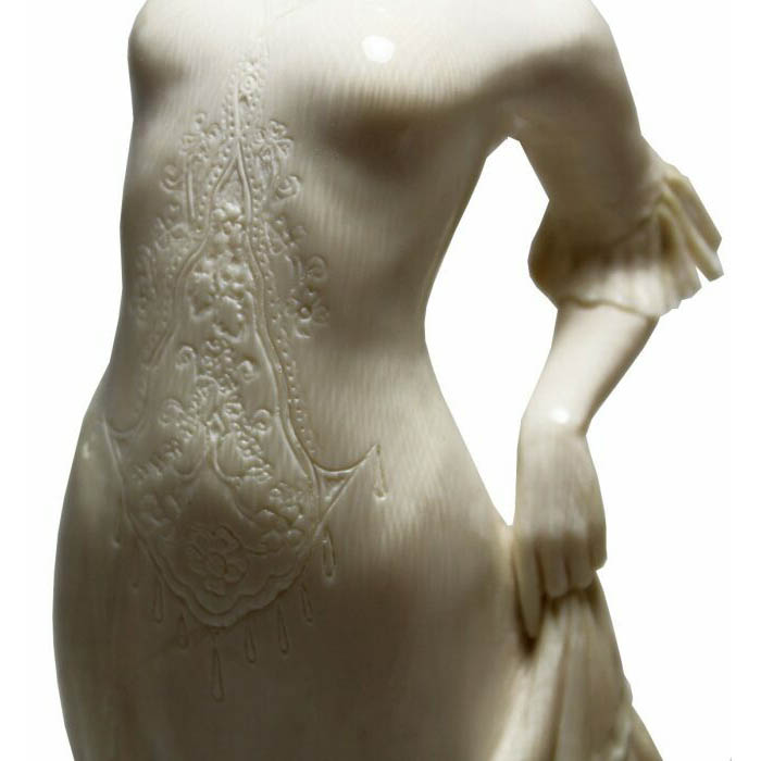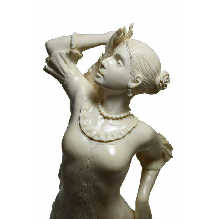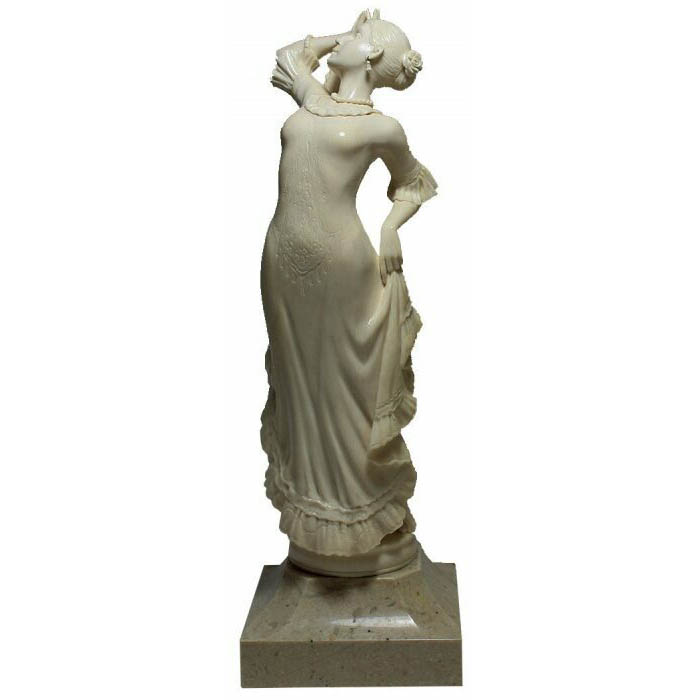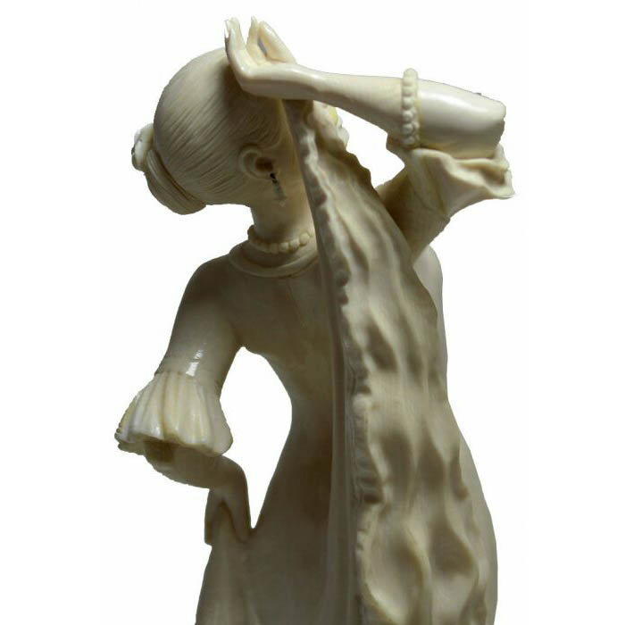 Бивень мамонта — реликвия, рожденная в недрах времени, пережившая целые цивилизации, чтобы обрести новую жизнь в руках мастера. Этот редкий материал несет в себе силу веков, холод древних льдов, ставших хранителями его текстуры, его нежного, почти живого тепла. В руках художника он превращается в тончайшую ткань, в живую кожу, в чувственный шелк, ласкающий женский силуэт. В этом материале сокрыта память о тысячелетиях, и каждая линия этой скульптуры — отзвук вечности.