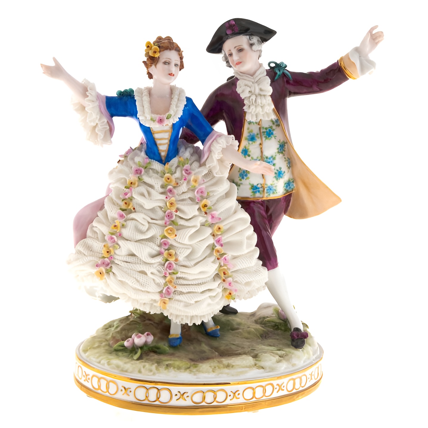 Фарфоровая скульптура «Танец» — это воплощение лёгкости, изящества и утончённого светского искусства XVIII века. Молодая пара застыла в элегантном па, будто под звуки менуэта, наполненного игривым кокетством и светлой радостью. В движениях читается галантность и взаимное внимание, а легкие повороты головы, вытянутые руки и едва заметный наклон корпуса придают сцене живость и музыкальный ритм. Это не просто танец — это язык тела, выражающий чувства и характер эпохи, где жест и шаг значили больше слов. Скульптура словно оживляет забытые баллы, погружая зрителя в атмосферу тонких чувств и церемонной любезности.