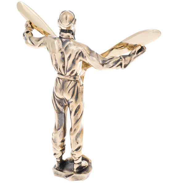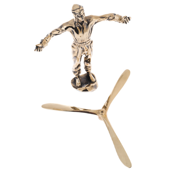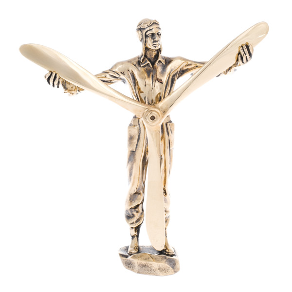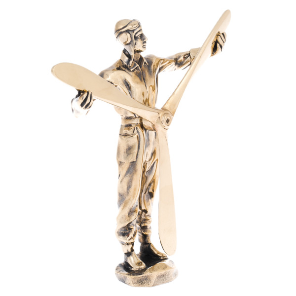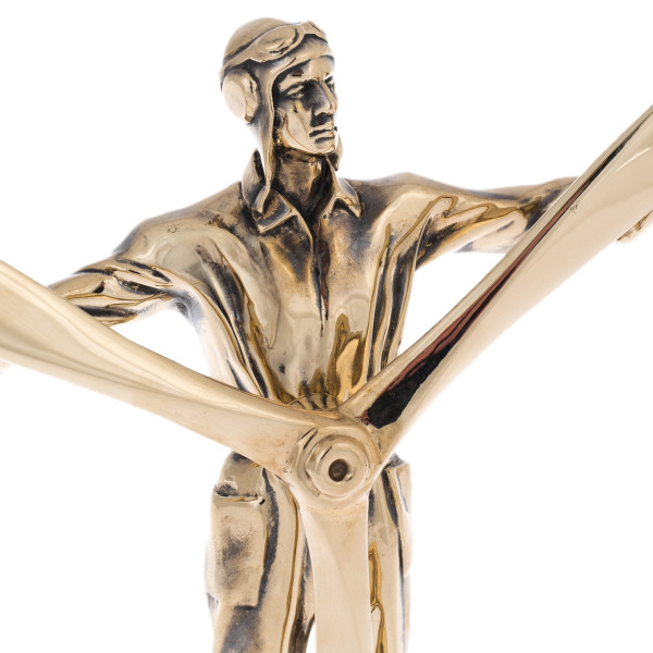 Фигура пилота, выполненная из латуни, с изяществом передает грациозность и силу человека, привыкшего бороться со стихиями. Его уверенная стойка, сильные руки, держащие массивный пропеллер, словно символизируют момент перед стартом — мгновение, когда мечты превращаются в реальность, а земля уступает место бескрайнему небу.