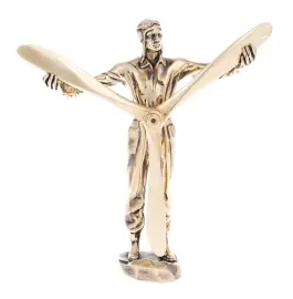 Статуэтка из латуни "Авиатор" Статуэтка из латуни "Авиатор" Статуэтка "Авиатор" воплощает собой триумф человеческой смелости и стремления к покорению небес. В этой композиции каждый элемент служит воспеванием легендарной профессии, олицетворяющей мечту о свободе и дух новаторства. Фигура пилота, выполненная из латуни, с изяществом передает грациозность и силу человека, привыкшего бороться со стихиями. Его уверенная стойка, сильные руки, держащие массивный пропеллер, словно символизируют момент перед стартом — мгновение, когда мечты превращаются в реальность, а земля уступает место бескрайнему небу. Пропеллер, выполненный с ювелирной точностью, легко отсоединяется, что добавляет композиции интерактивности и подчеркивает мастерство исполнения. Его гладкая, отполированная поверхность отражает свет, создавая иллюзию движения, как будто машина вот-вот оживет и взлетит. Особое внимание уделено деталям: летная куртка, шлем с очками, фактура ткани — всё это выполнено с тщательной проработкой, создающей ощущение реализма. Каждый изгиб, каждая линия подчеркивают силу и решимость пилота, улавливая суть его характера. Основание статуэтки, лаконичное и устойчивое, служит идеальным фоном для композиции, оставляя пространство для созерцания этой художественной работы. Латунь, из которой выполнена фигура, олицетворяет не только прочность, но и благородство, делая изделие не только украшением интерьера, но и ценным символом успеха. "Авиатор" — это больше, чем статуэтка, это история, рассказанная через металл, момент, запечатленный навечно. Она будет вдохновлять своего обладателя не бояться высоты, стремиться к новым горизонтам и гордиться тем, что человек способен подняться выше облаков.