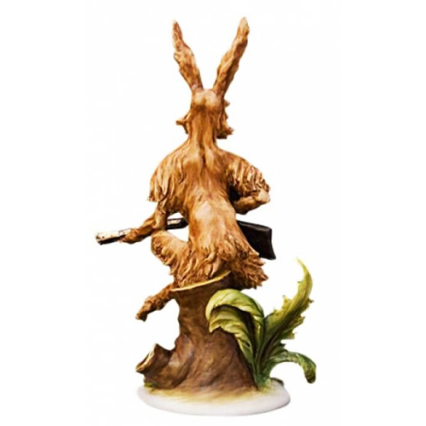 Скульптура выполнена из высококачественного фарфора, расписанного вручную в тёплой, насыщенной палитре. Одежда героев — вязаные носки, засученные рукава, грубые ботинки, патронташи и охотничья сумка с трофеем — передана с невероятной точностью и вниманием к деталям. Мастера бережно отразили всё: морщины на лицах, жестикуляцию рук, фактуру шерсти собаки и даже мятые штанины. Композиция установлена на волнообразном основании с золочёным узором, подчёркивающим декоративную завершённость сцены. Контраст между яркими красками и естественной пластикой образов делает скульптуру особенно живой и выразительной.