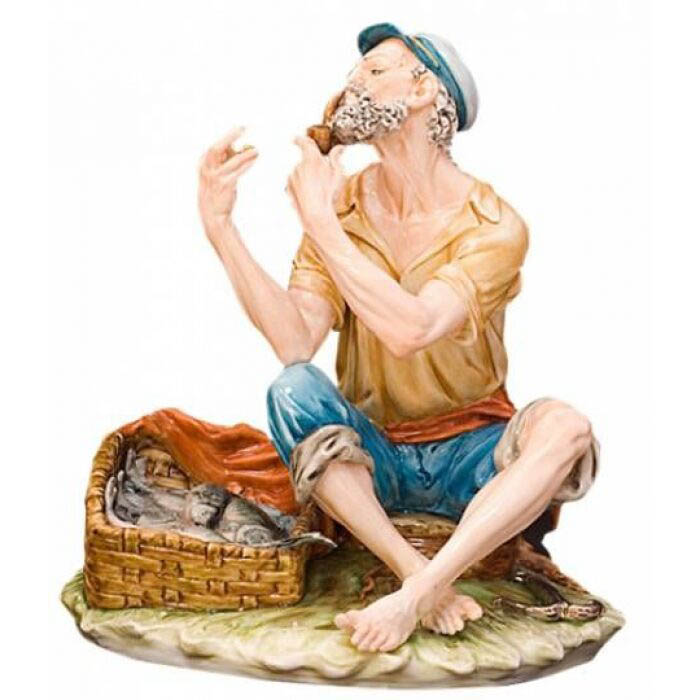 Фарфоровая скульптура «Рыбак с трубкой» — это жанровая сцена, наполненная теплом, простотой и искренним очарованием деревенского быта. Пожилой рыбак, сидящий на земле с корзиной свежего улова, изображён в момент неспешного отдыха: он с наслаждением затягивается трубкой, прикрыв глаза и чуть задрав голову, словно вдыхает не только дым, но и свежий воздух прибрежного утра. Его поза передаёт полное расслабление — согнутые ноги, босые ступни, свободно обнажённые руки и полуоткрытая рубашка создают образ человека, живущего в гармонии с ритмами природы.