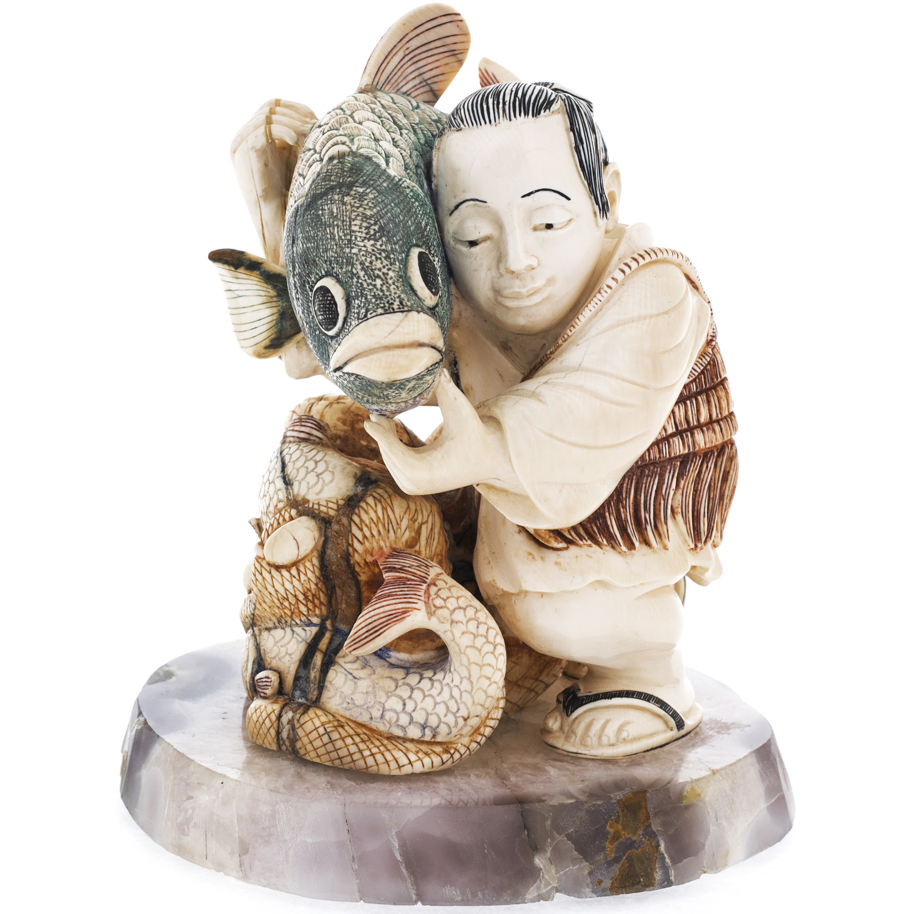 Этот великолепный сувенир "Рыбак", выполненный из бивня мамонта, олицетворяет богатство традиционной рыбацкой удачи и воплощает радость от обильного улова. Изображенный мужчина с живым восхищением обнимает огромную рыбу, демонстрируя связь человека с природой и радость от простых удовольствий жизни.