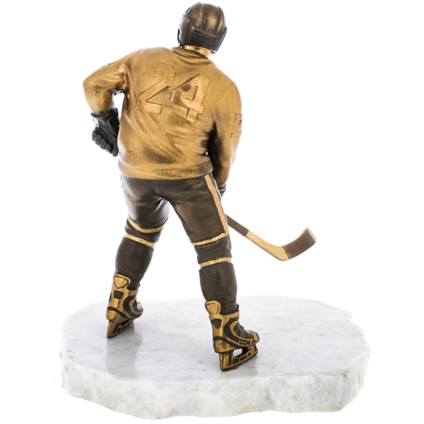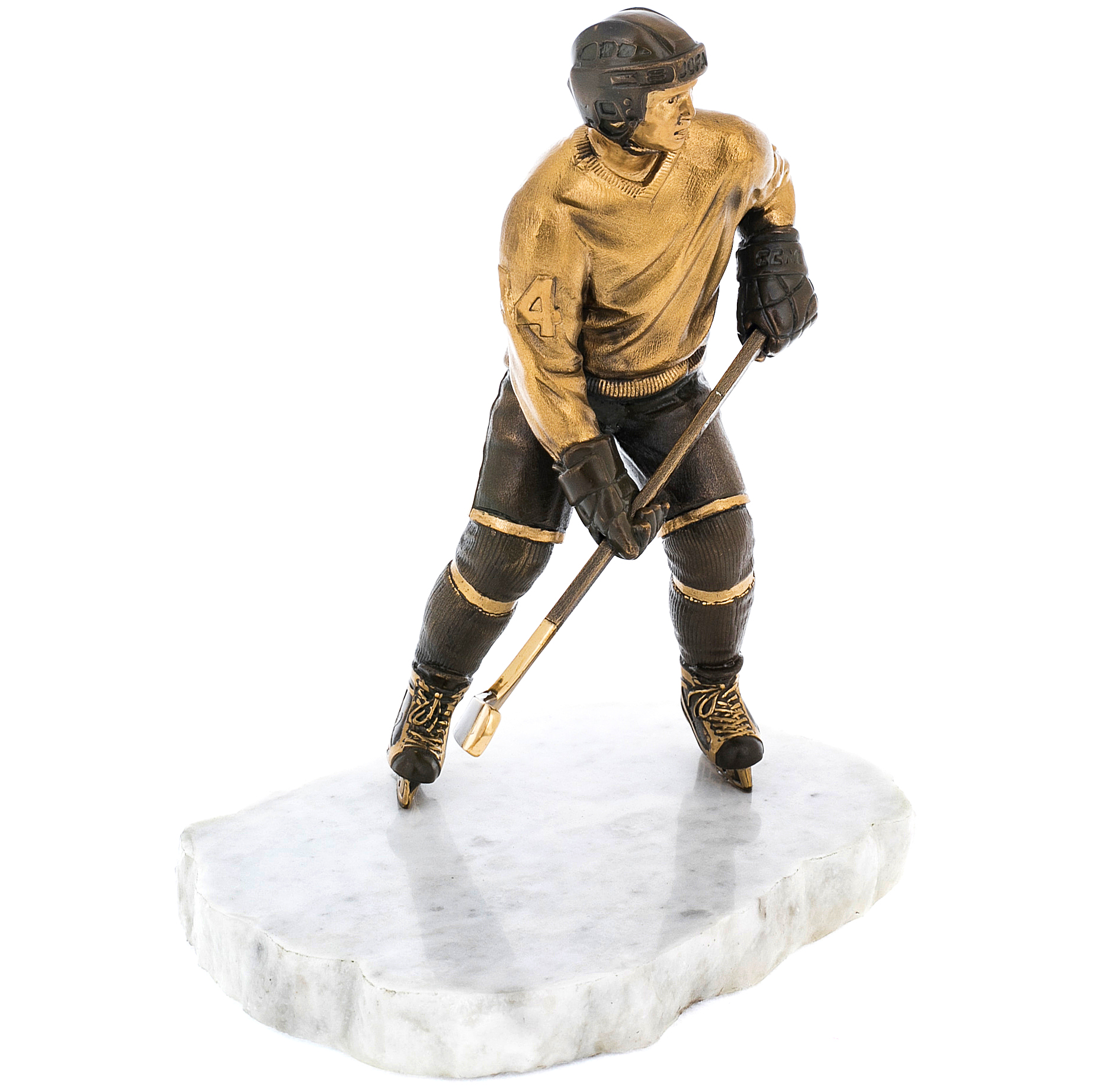 Бронзовая фигура установлена на постамент из натурального белого мрамора с живой природной текстурой, словно имитирующей лёд, над которым затаился игрок. Камень отполирован до гладкости, сохранив природный рисунок, делающий каждое основание уникальным. Гармония материалов и форм создаёт ощущение сдержанной монументальности — предмет смотрится основательно, но при этом не теряет динамики. Пропорции соблюдены с исключительным вниманием: тело передаёт пластику движения, а поза, замеревшая на грани действия, рождает в зрителе предчувствие вспышки скорости.