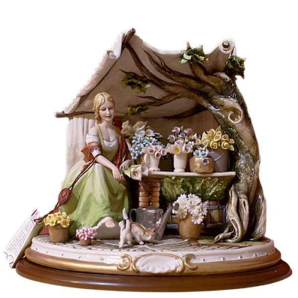 Фарфоровая композиция «Цветочница с котятами» — это миниатюрная поэма о покое, природе и прелести простых радостей. Молодая девушка в светло-зелёном платье, присев под навесом из ткани и древесных ветвей, окружена пышными букетами весенних цветов, расставленных на деревянной лавке. На её лице — светлая задумчивость, в позе — расслабленность, в окружении — атмосфера уюта и живого дыхания деревенского утра. У ног девушки играют два котёнка, добавляя сцене живости и нежности, а рядом — плетёная корзина и садовый инструмент, подчёркивающие труд и заботу, скрытые за этой красотой.