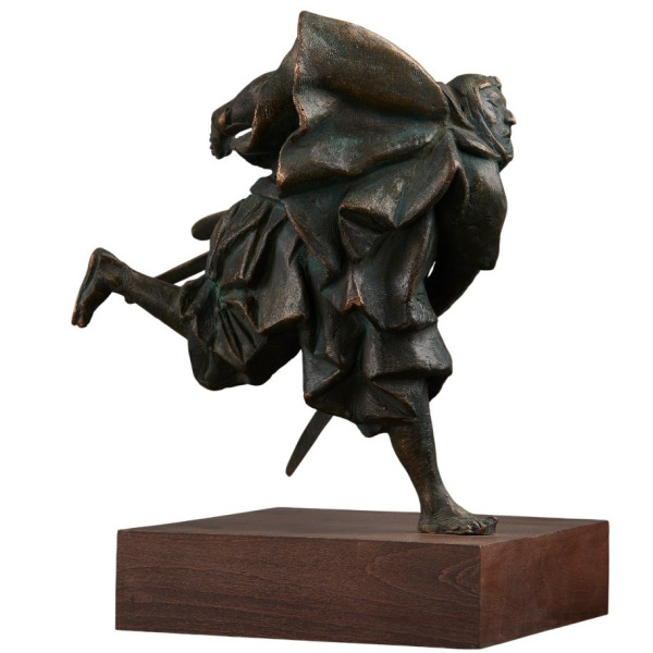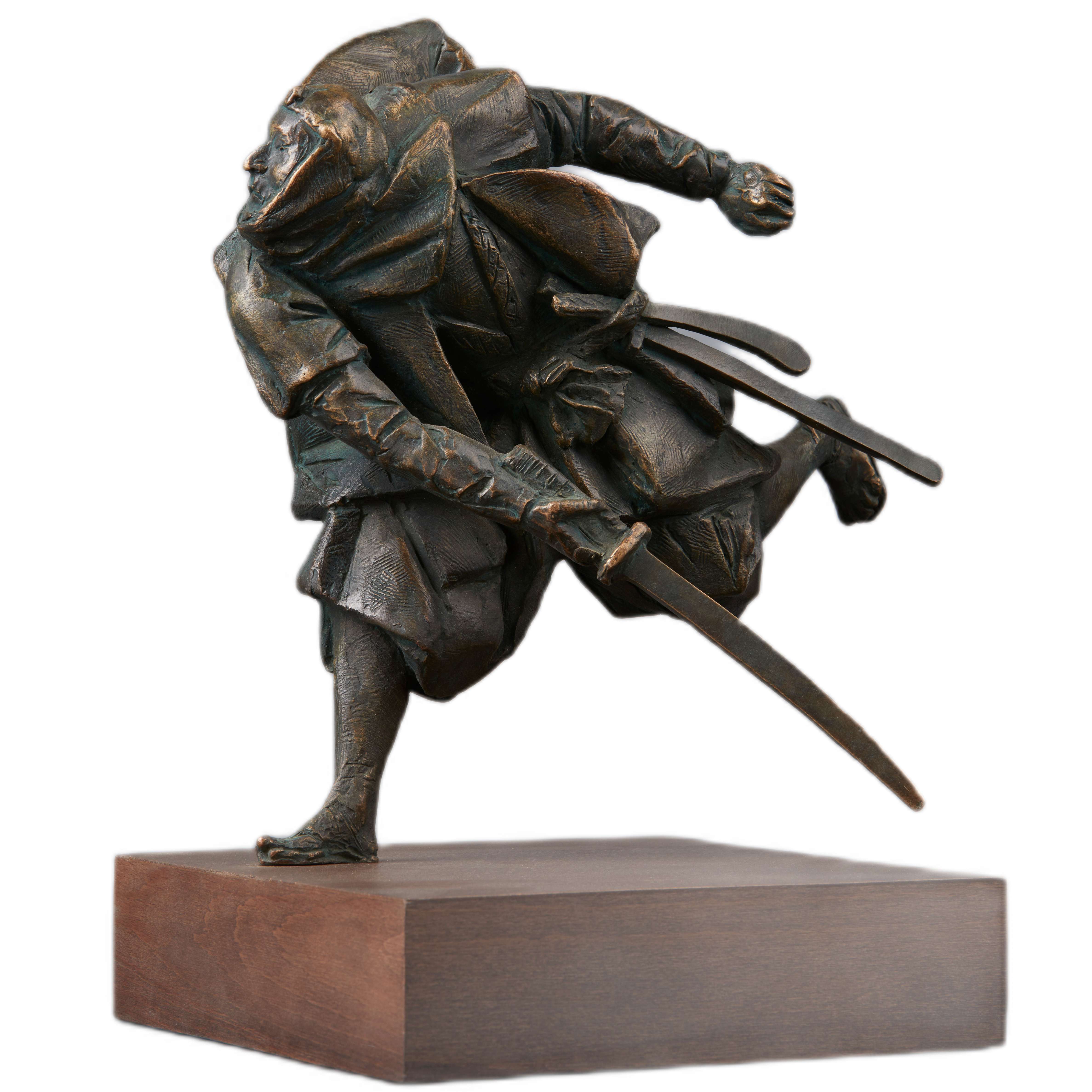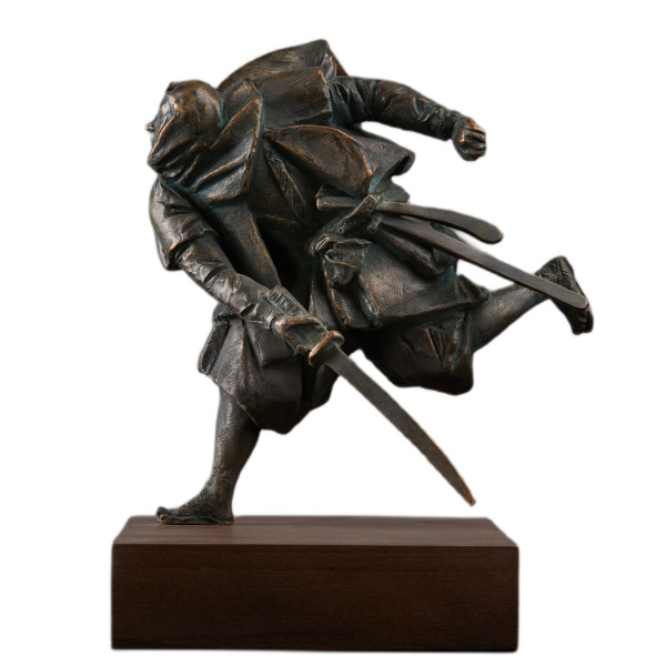 Мастерство владения мечом самурая определялось количеством взмахов меча — чем их меньше, тем выше умение воина. Со временем в Японии сложилась целая школа «Искусства одного удара» — иайдо. Эта скульптура визуализирует идею полной собранности перед молниеносным действием. Объём фигуры построен на игре драпировок: складки одежды словно развиваются в потоке воздуха, при этом отлиты с точностью, заставляющей бронзу казаться застывшей материей. Каждый изгиб продуман и выразителен, словно фиксирует внутреннюю тишину перед вспышкой движения.