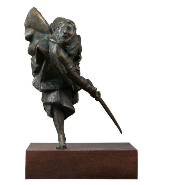 Контраст тёмной патинированной бронзы с гладким деревянным основанием придаёт композиции дополнительную глубину. Это не просто изображение — это пластический дзен, обращённый к тем, кто ощущает силу молчания, точность жеста и чистоту внутреннего импульса. Скульптура «Воин 2» адресована знатокам: тем, кто видит в боевом искусстве не ярость, а форму внутреннего порядка и уважение к пути самосовершенствования.
