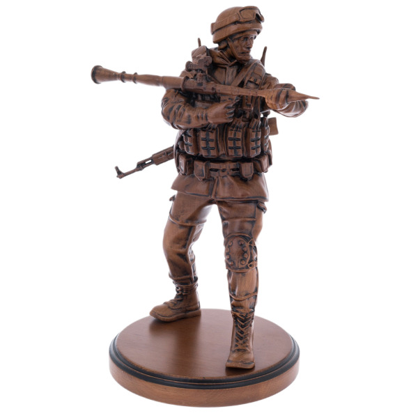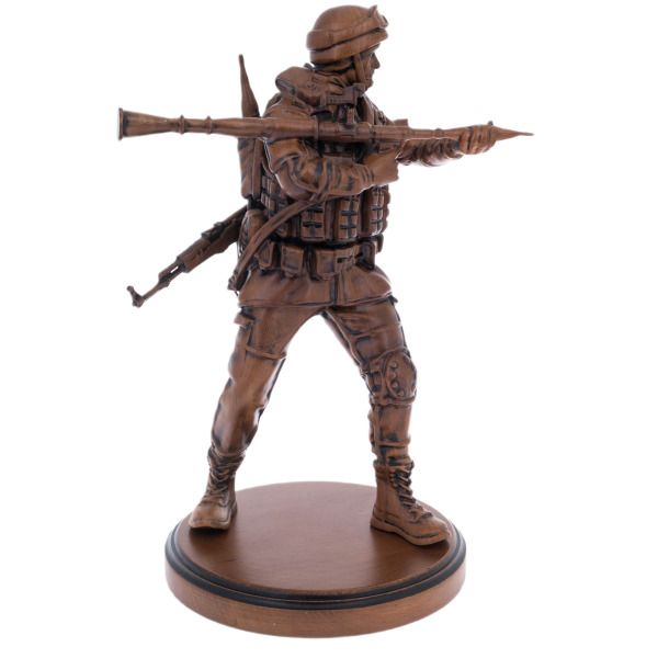 Статуэтка солдата, вырезанная из благородного бука, возвышается подобно олицетворению неукротимой силы и непоколебимой воли, словно страж, охраняющий ваш мир от бурь судьбы. Изящные линии его обмундирования, с гранатомётом, указывающим путь, и автоматом, покоящимся на плече, шепчут о героизме, выкованном в пламени испытаний. Этот деревянный воин сияет внутренним огнём, обещая своему владельцу не только эстетическое восхищение, но и ощущение власти над временем, где каждый изгиб резьбы становится отражением вечной борьбы и триумфа.