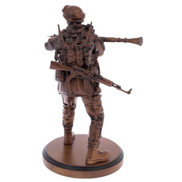 Поставленная на массивный деревянный пьедестал, статуэтка подобна колонне, поддерживающей небосвод вашего величия. Её бронзовый оттенок, подчёркнутый искусной проработкой деталей — от бронежилета до тяжёлых ботинок, — напоминает о стойкости, достойной легенд. Взгляд, устремлённый вперёд, словно зовёт к новым горизонтам, а каждая гравировка, словно шрам на теле воина, повествует о славе, доступной лишь тем, кто владеет судьбой.