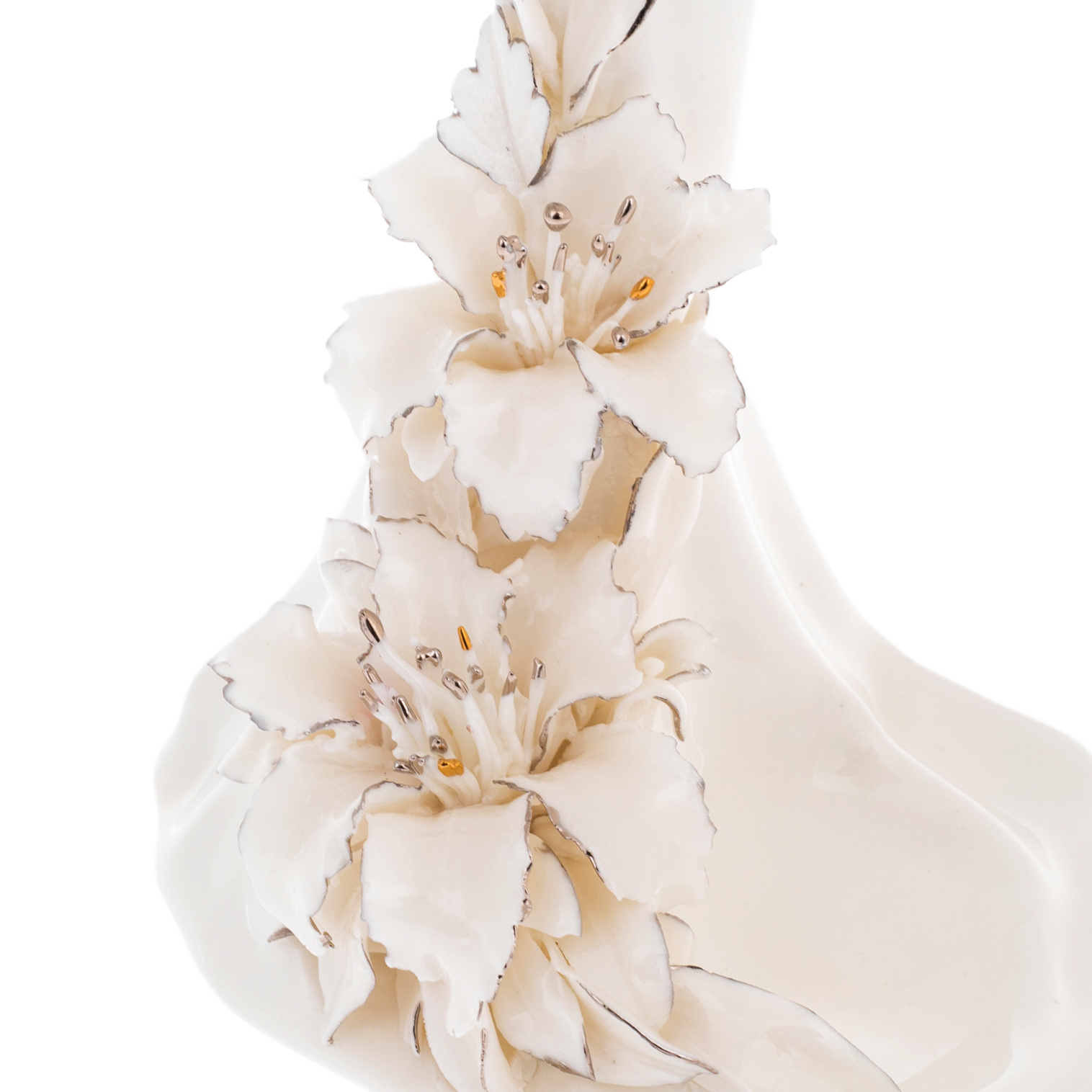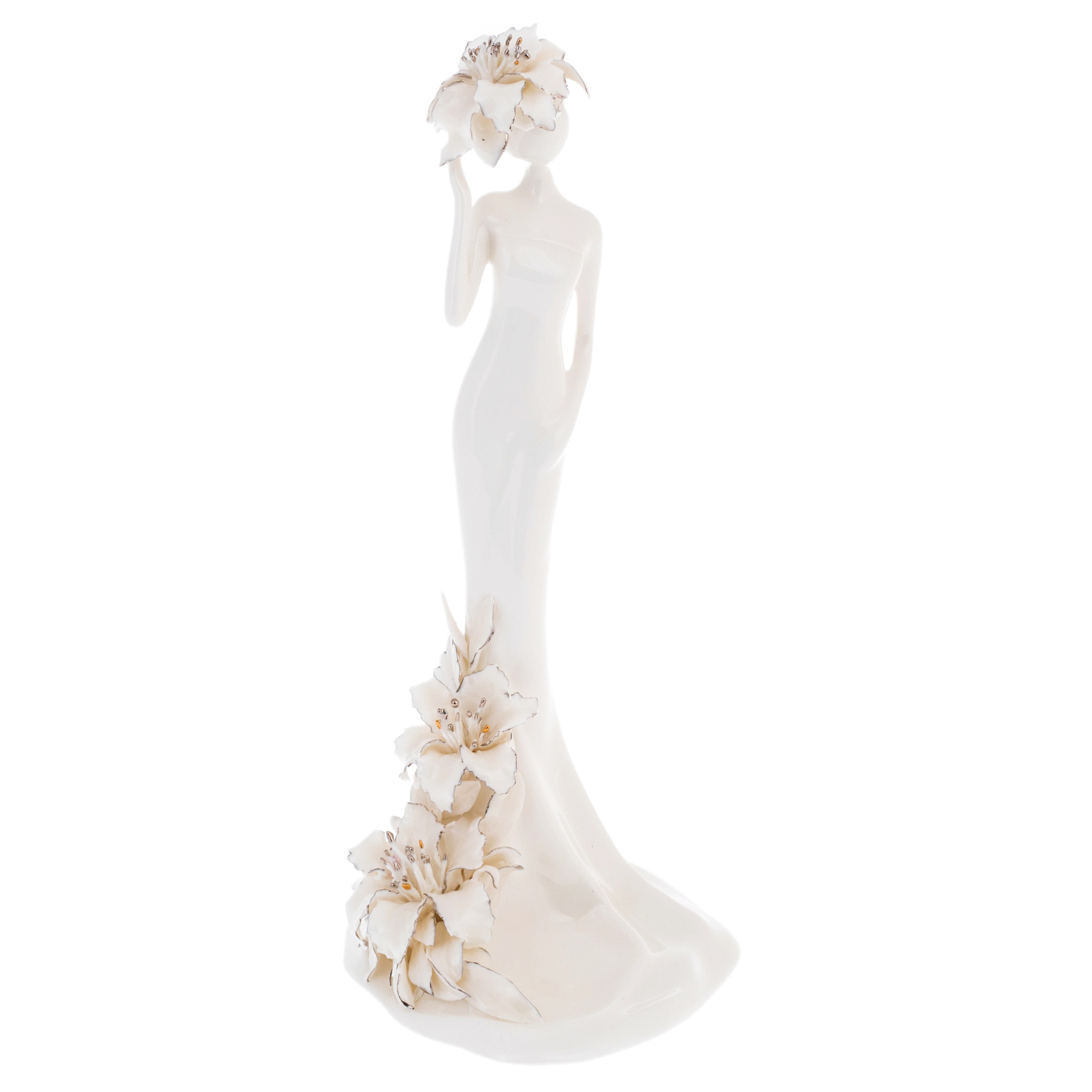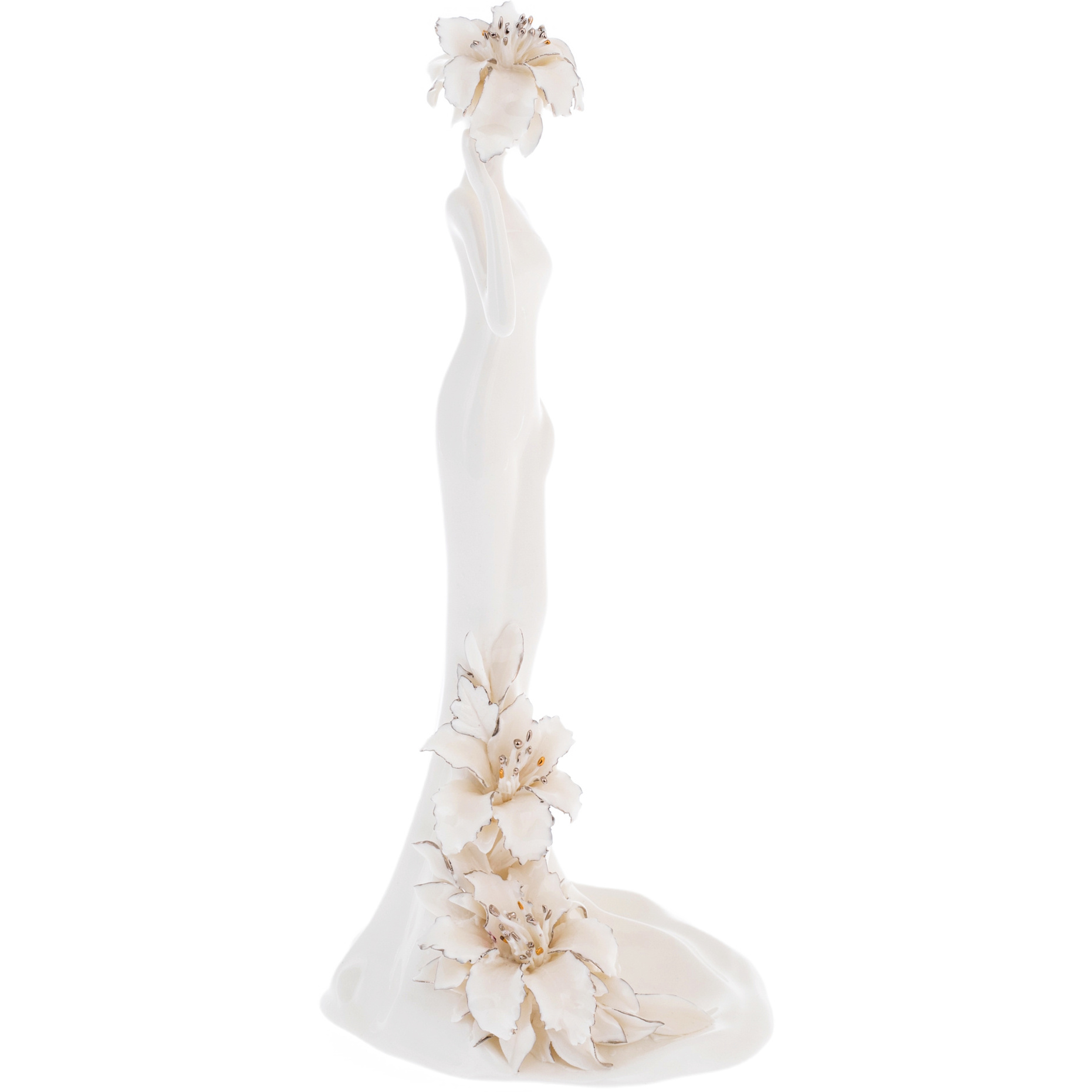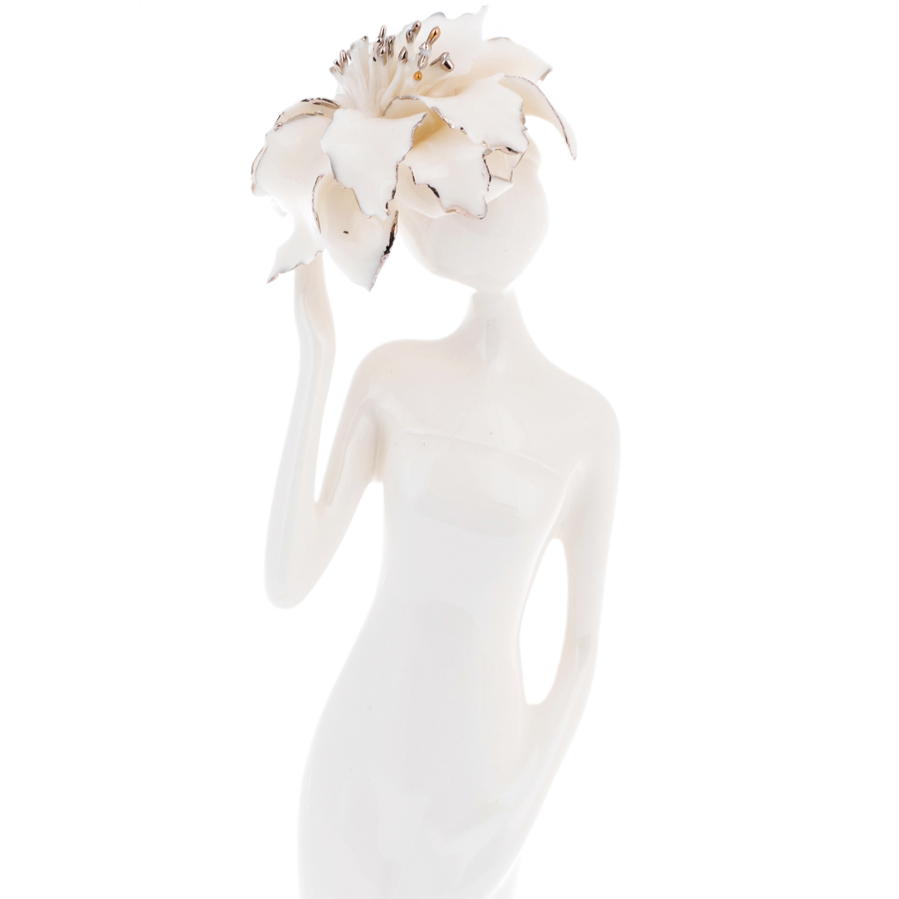 Её наряд — это воплощение совершенства, где каждая линия выполнена с поистине безупречным мастерством. Белоснежный фарфор, будто созданный для того, чтобы ловить свет, обвивает фигуру, как утренний туман, в его безупречной белизне скрыты сила и мощь, присущие только истинному искусству. Лилия на голове леди символизирует чистоту и совершенство, как и сама фигура, которая всем своим существованием демонстрирует идеал красоты.