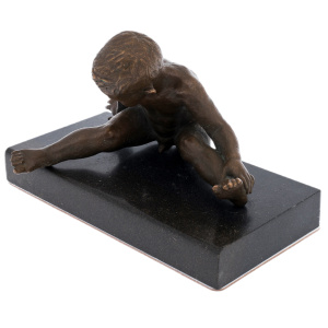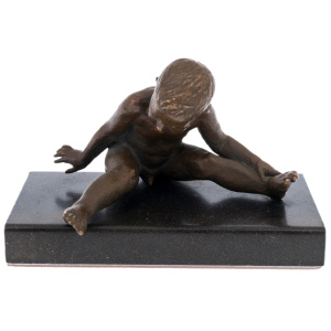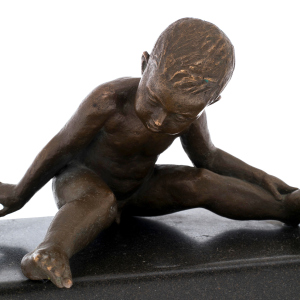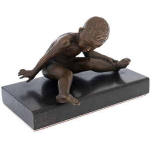 Станковая скульптура из бронзы «Мальчик» предстает редким примером пластики, создающей ощущение полной естественности детского движения. Фигура маленького ребёнка, сидящего на гладком каменном постаменте, исполнена с точностью, достигаемой лишь вручную проработанной бронзой: мягкие линии спины, лёгкая округлость плеч, почти невесомый наклон головы, подчёркивающий сосредоточенное внимание на собственных ногах. Бронза, покрытая тёплой патиной, передаёт оттенки живой кожи, а лёгкая шероховатость фактуры рождает впечатление прикосновения к подлинному телу, застывшему в моменте первой самостоятельной игры.