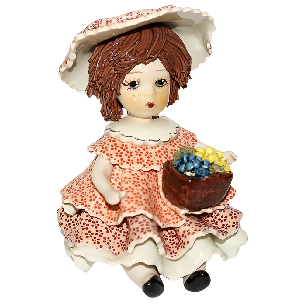 Фарфоровая статуэтка "Кукла с темными волосами и с цветами, сидящая в розовом платье"