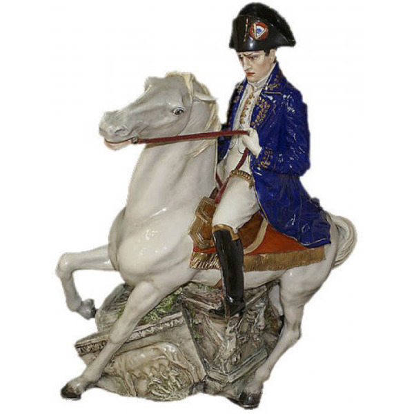 Фарфоровая статуэтка «Наполеон. Победитель» — мощный образ человека, изменившего карту Европы, воплощённый в благородной и динамичной форме. Наполеон изображён в момент напряжённой сосредоточенности: на гарцующем белом жеребце, облачённый в синий мундир с золотым шитьём, в треуголке с кокардой и в высоких сапогах, он словно готов прорваться сквозь веяние времени. Жест правой руки, управляющей поводьями, полуповорот головы, напряжённая посадка — всё говорит о воле, дисциплине и абсолютной уверенности в собственном предназначении. Породистая лошадь, застыла на возвышении с выгнутой шеей и сильными ногами, подчёркивая величие всадника.