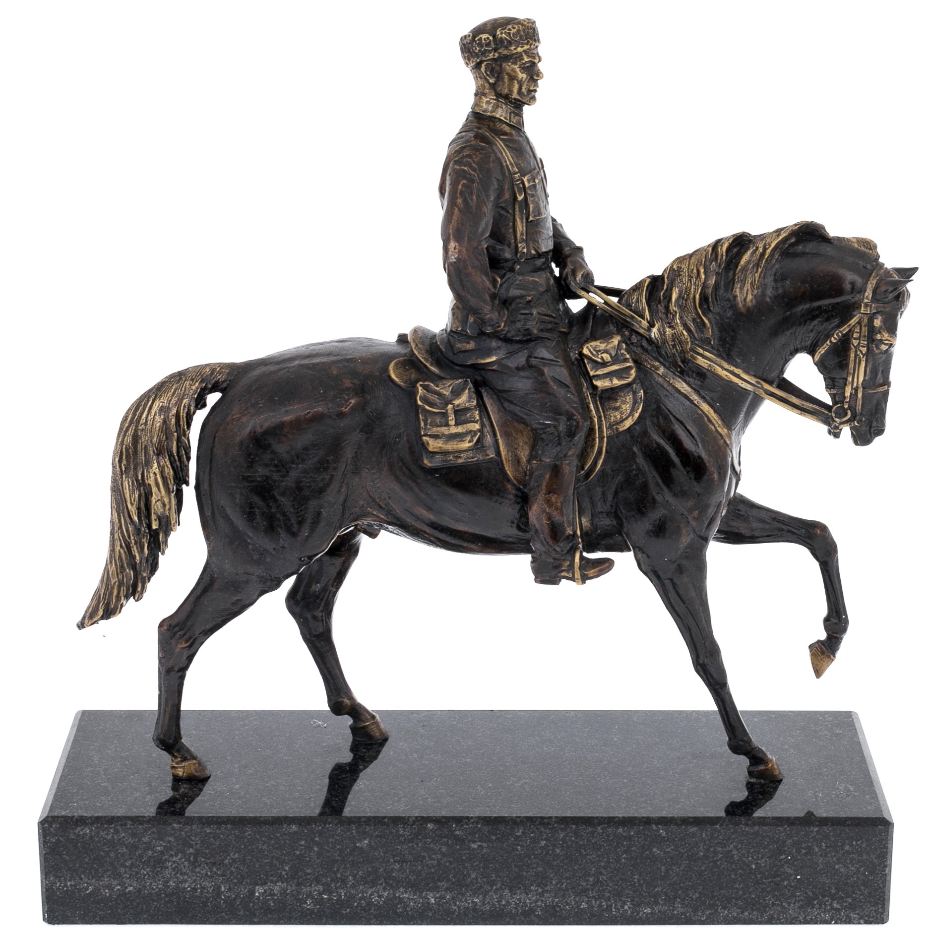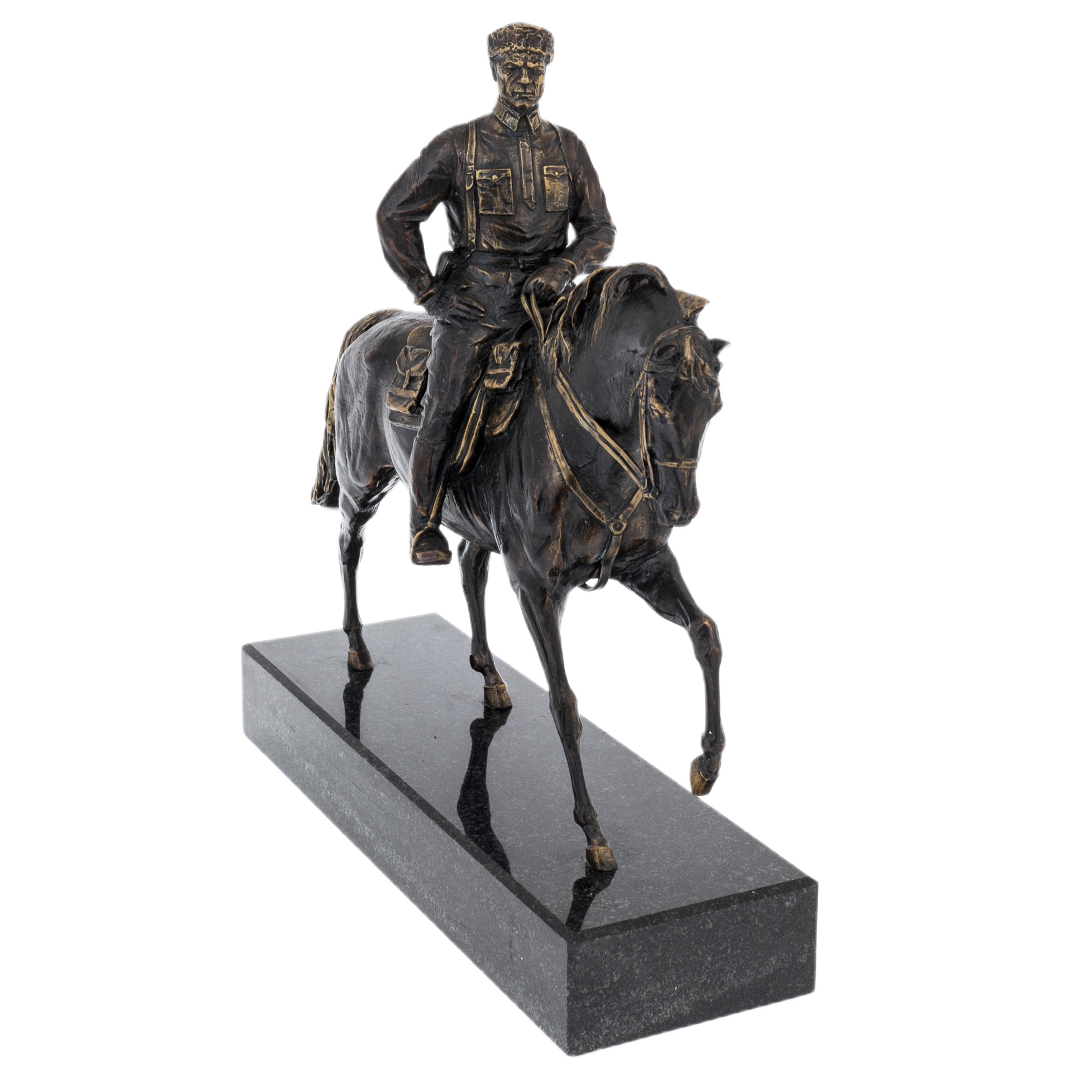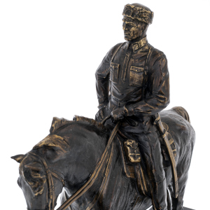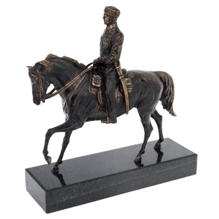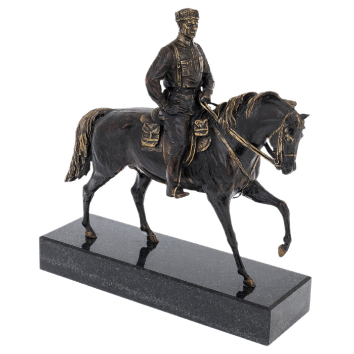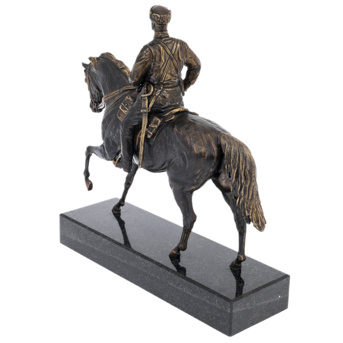Латунь, покрытая патиной, раскрывает достоинство материала через игру света и тени: углубления темнеют, рельефные грани мягко высветлены, подчёркивая складки одежды, ремни, детали седла и гриву. Пластика литья дополнена ручной доводкой — заметной в точности черт лица, в чётких линиях амуниции, в аккуратной моделировке копыт и мышц корпуса. Патинирование придаёт поверхности эффект благородной старины, а выборочные участки, отполированные до тёплого металлического блеска, создают тонкий контраст, благодаря чему композиция воспринимается цельно и дорого даже при сдержанной палитре.