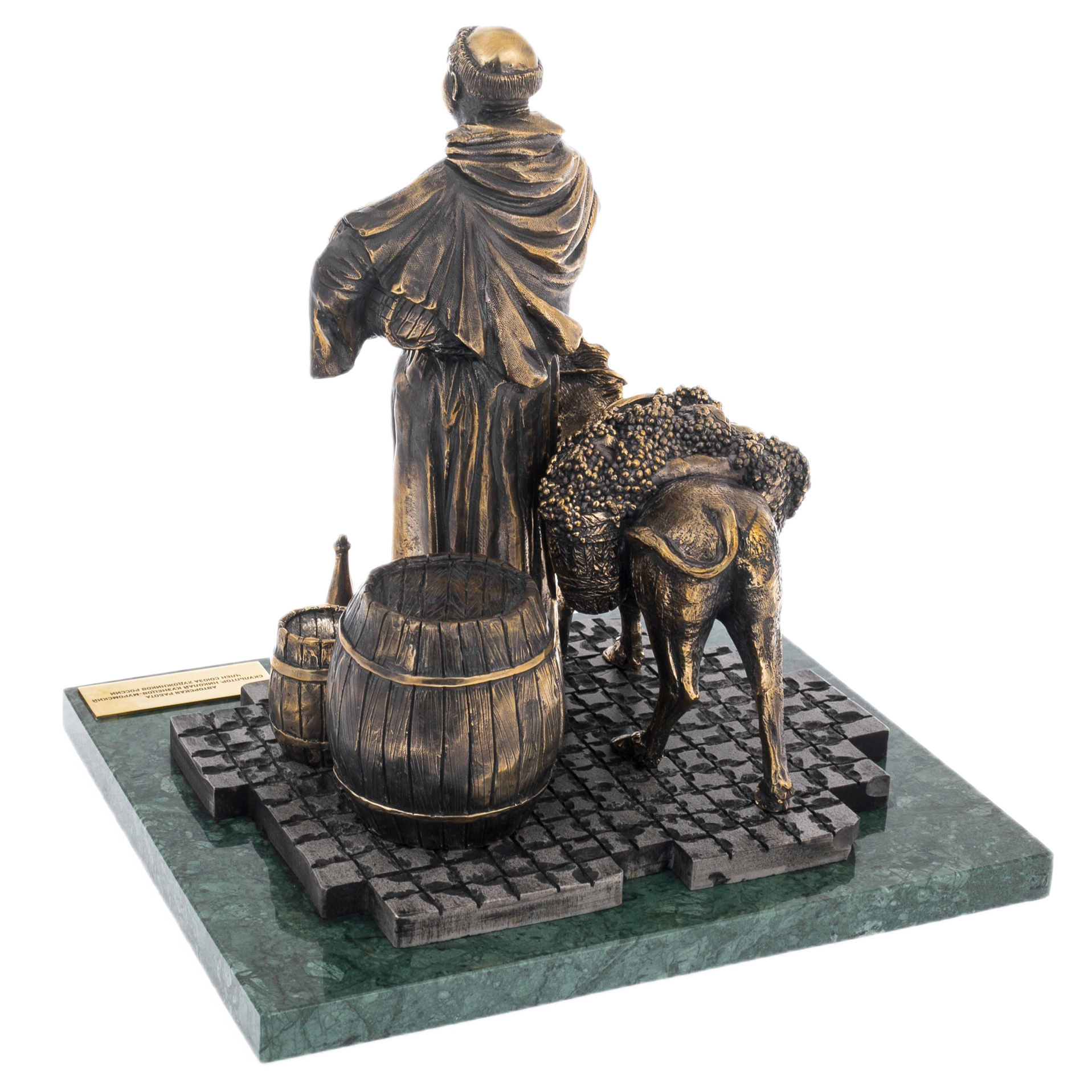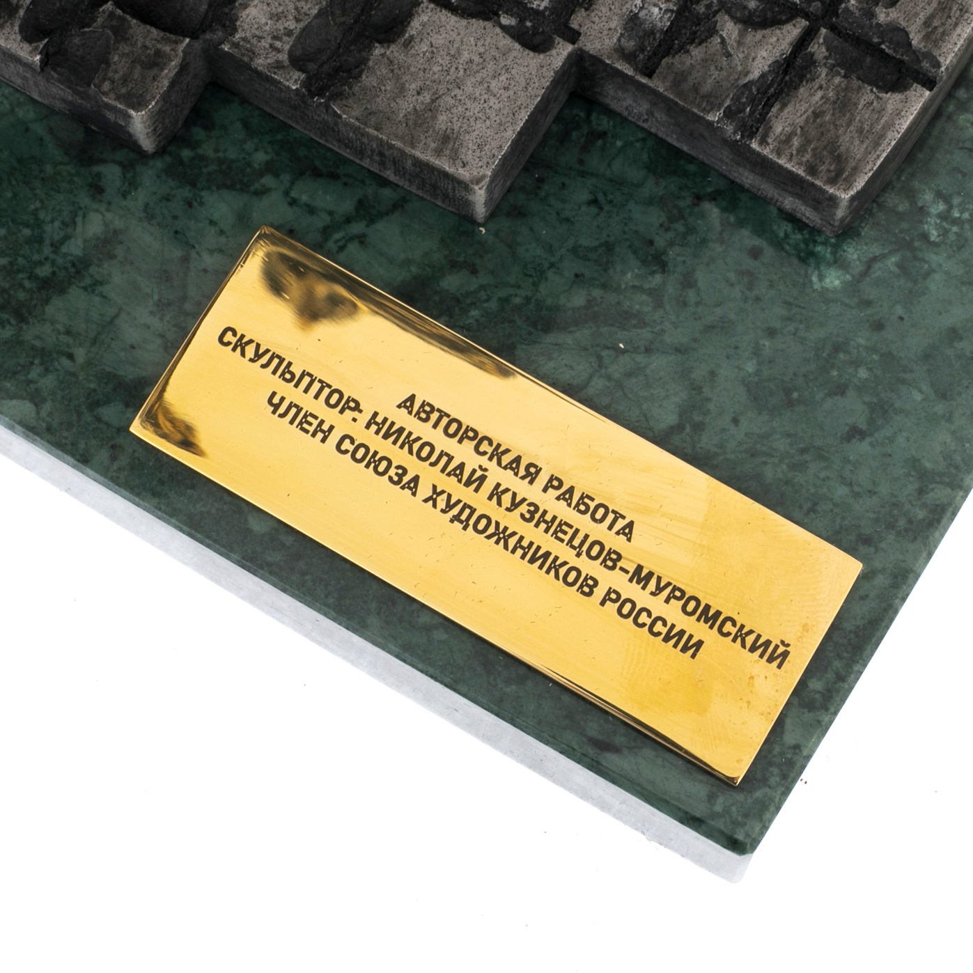 Основание из зелёного мрамора придаёт работе устойчивость и монументальность. Камень, с его естественной текстурой и глубоким оттенком, подчёркивает благородство бронзы и усиливает ощущение торжественности.