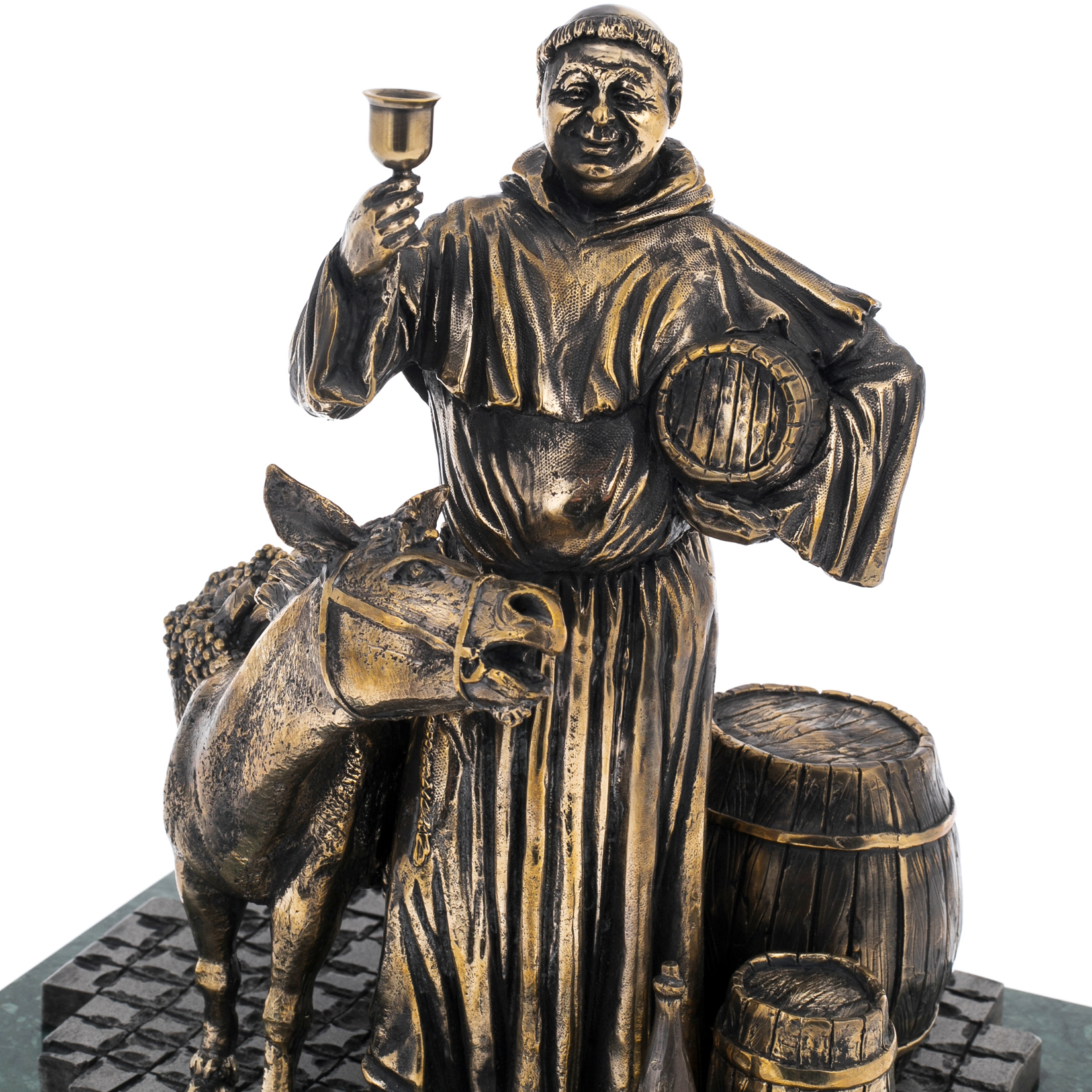 Внимание к деталям поражает. Капюшон и складки монашеского одеяния выполнены с такой точностью, что бронза словно оживает, передавая мягкость и пластичность ткани. Бочонок под рукой монаха и стоящие рядом деревянные кадки создают уютный мир, где все элементы говорят о земных радостях, неразрывно связанных с простотой и скромностью.