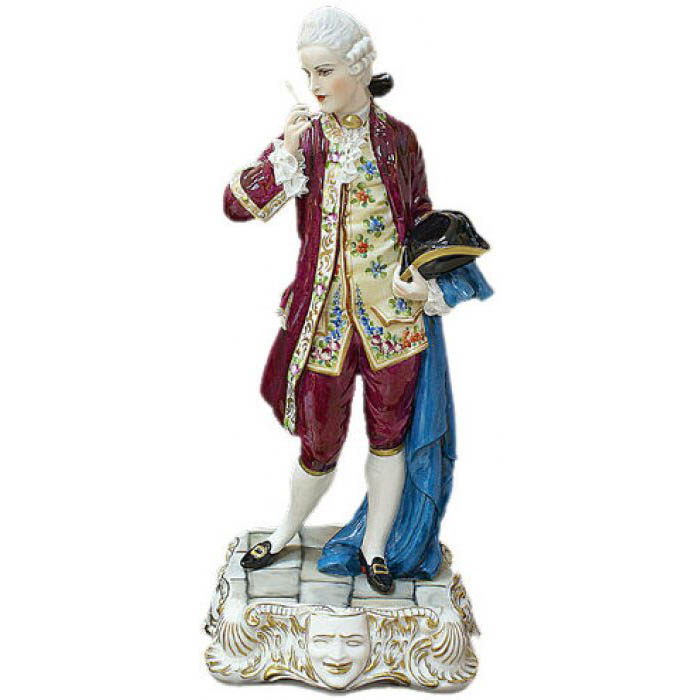 Фарфоровая статуэтка «Флориндо» — изысканная ода театральной маске, светскому обольщению и эстетике эпохи рококо. Мужская фигура застыла на пьедестале, украшенном резным театральным анфасом — символом лицедейства и игры. Молодой кавалер, одетый в пурпурный камзол с изысканным золотым жилетом, украшенным пышной цветочной вышивкой, приподнял маску к лицу — жест на грани признания и кокетства. В одной руке он держит треуголку, в другой — театральный реквизит, а его белоснежный парик и уверенная осанка создают образ искушённого участника великосветской сцены.