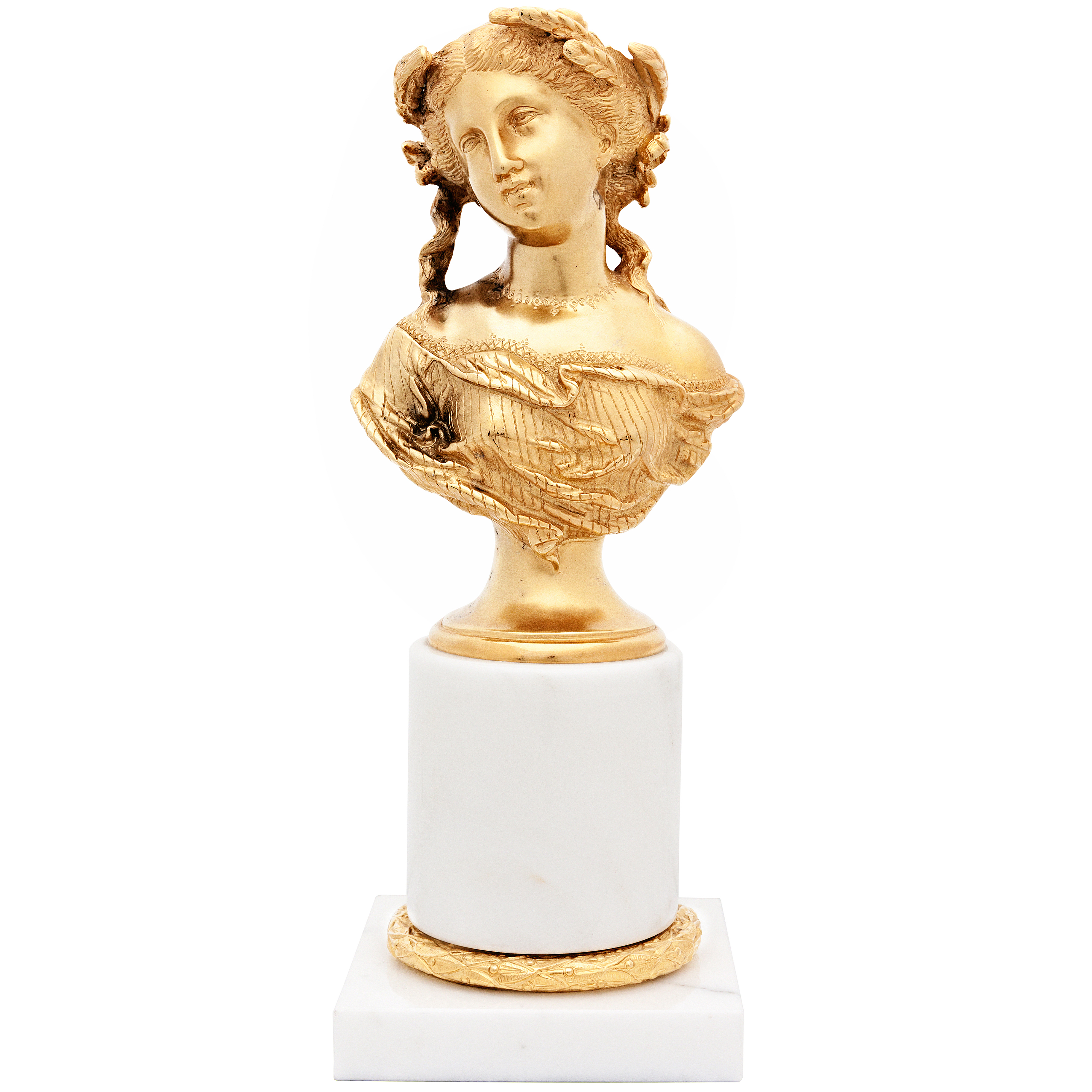 Благородный белый мрамор, доведённый до совершенства искусными руками мастеров, создаёт ощущение невесомости и чистоты. Позолоченные элементы наполняют бюст сиянием и придают ему особую торжественность. Лёгкие складки одежды, исполненные с ювелирной точностью, передают движение воздуха, будто ветер игриво играет с тканью, подчёркивая естественность и живость образа.