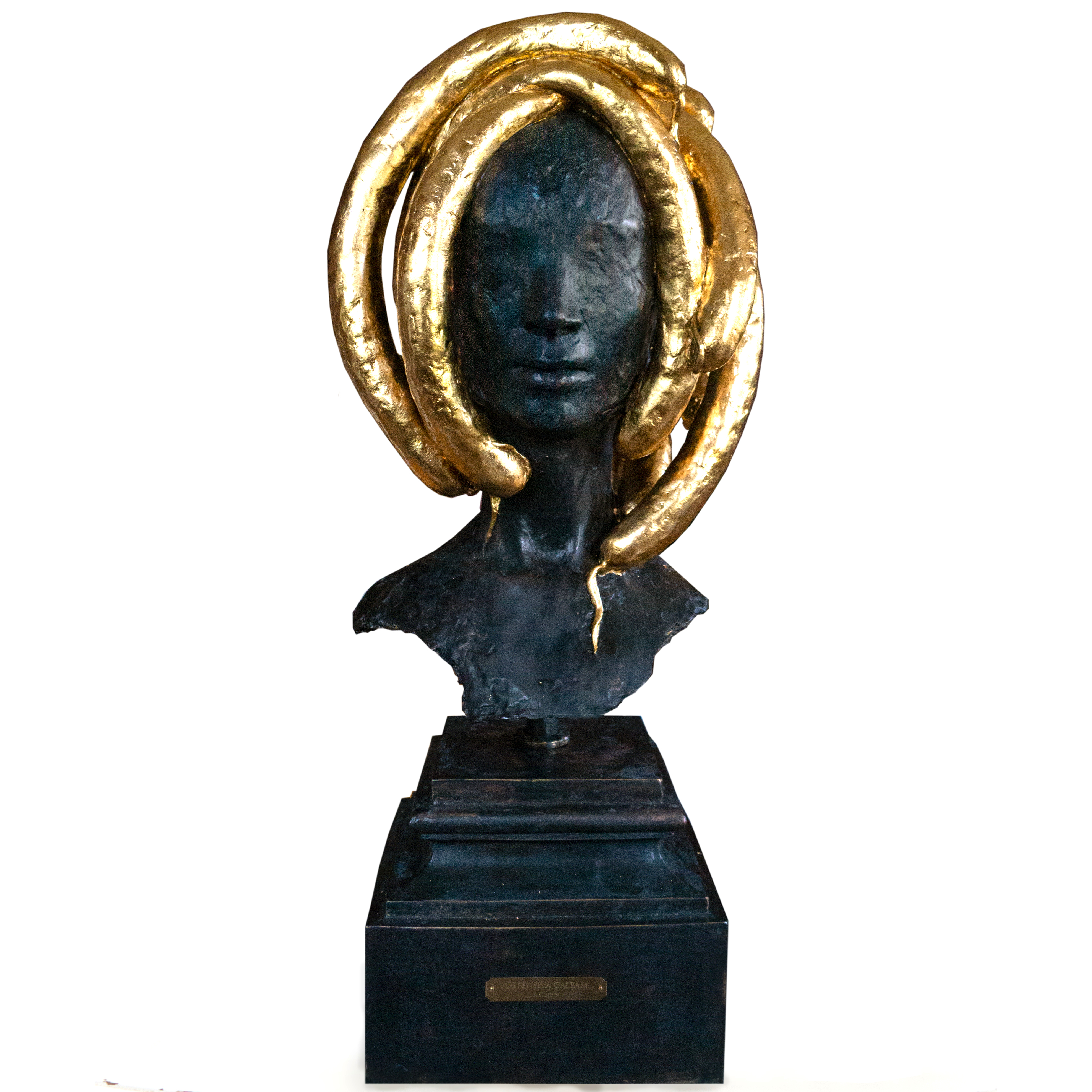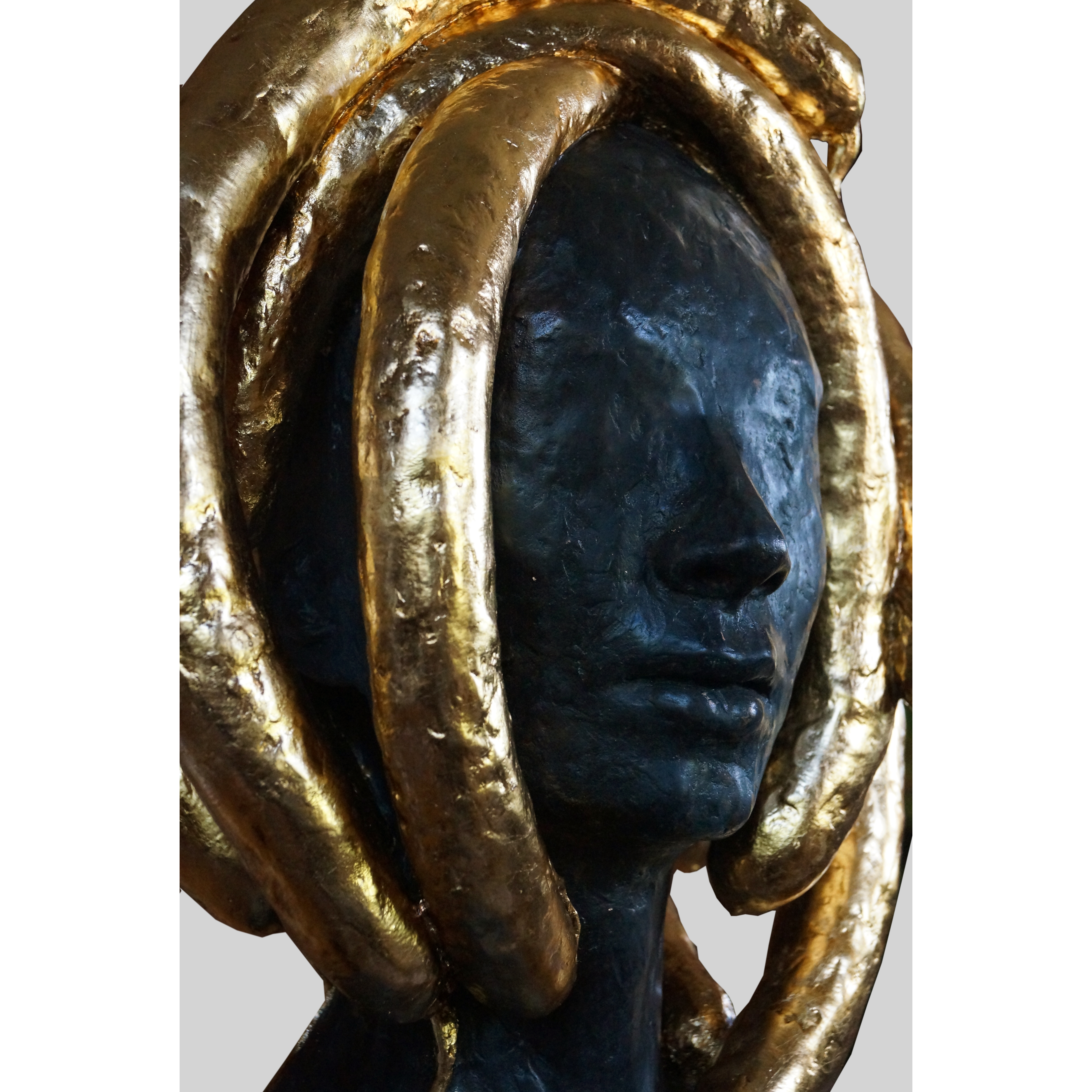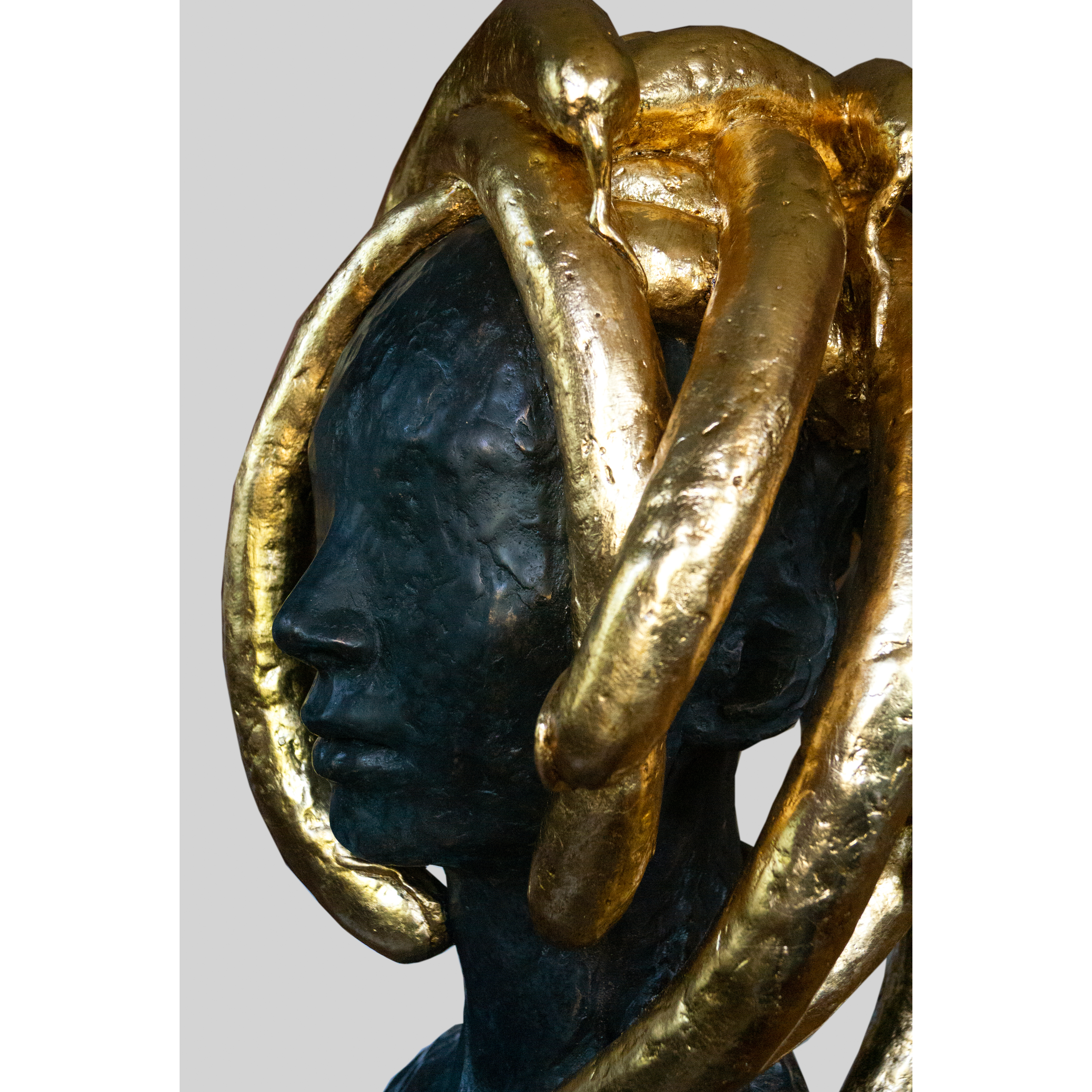Скульптура «Защитный шлем» — зримый манифест силы, покоя и защищённости. Молодая женщина, её черты мягки, но её образ окутан бронзовой неприступностью. На голову легла корона иной эпохи — золотые ленты, извиваясь, срастаются в замкнутый панцирь, обволакивая её в кольчугу безмятежности. Этот шлем — не символ битвы, но знак внутреннего спокойствия, достигнутого абсолютной уверенностью. Она не смотрит, но видит. Глаза закрыты, не потому что боится, а потому что бояться нечего. Мир подчинён её ритму и лишён резких движений и вторжений.