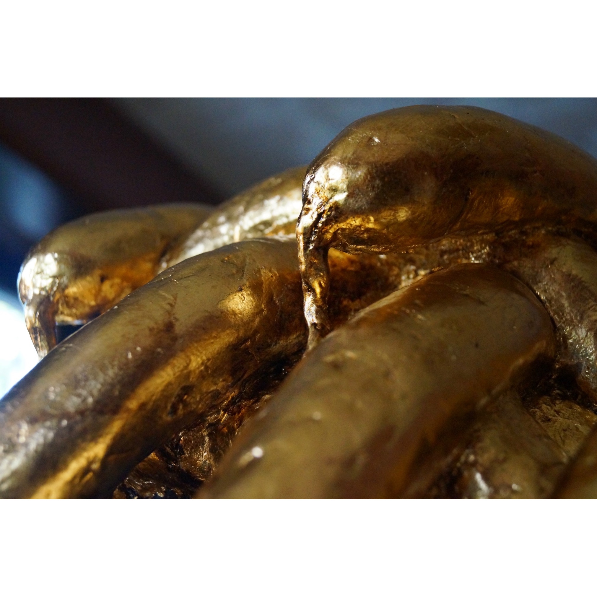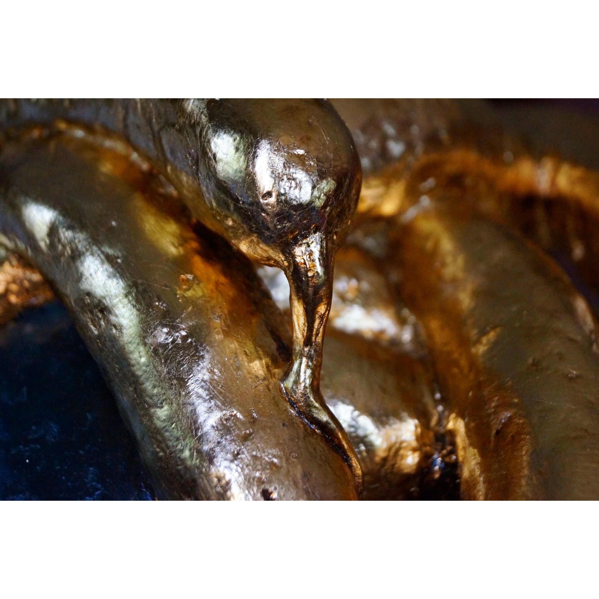 Патинированная бронза, словно застывшая в вечности, контрастирует с сиянием золочёной потали. Блеск и тень сплетаются в игре смыслов, создавая неуловимую грань между иллюзией и реальностью. Облик словно вышел из мифа, где защита — не доспех, а состояние души. Форма элегантна, но материальность её тяжела — 84 килограмма метала, в котором заключена идея непоколебимой уверенности, привилегии тех, кто не нуждается в оглядке.