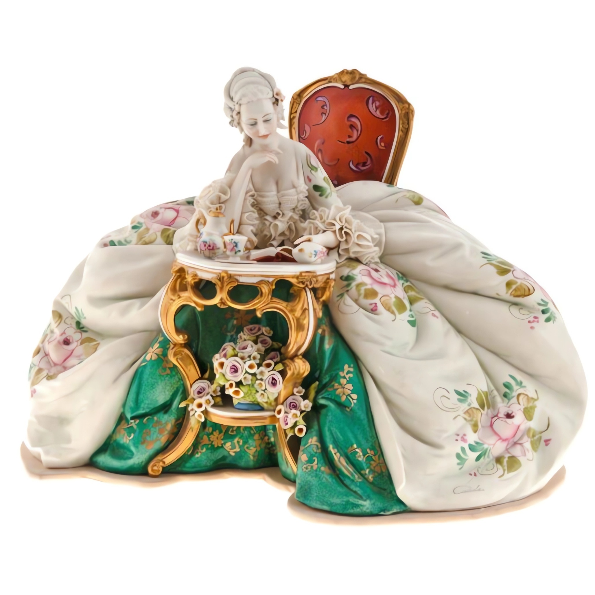 Композиция выполнена из тончайшего фарфора, расписанного вручную в мягких пастельных тонах. Наряд героини сочетает кремовый верх с крупными цветочными бутонами и изумрудно-зелёный низ с позолоченным узором, создавая гармоничную палитру, отсылающую к традициям салонной моды XVIII века. Резной кофейный столик, украшенный позолотой, служит не только функциональным элементом, но и художественным акцентом. Миниатюрный сервиз и корзина с цветами придают сцене живость, а декоративное кресло с алой бархатной спинкой завершает образ аристократической среды. Каждая деталь — от изящных пальцев до полупрозрачных кружев — создана с виртуозной точностью, передающей не только анатомию, но и внутреннее настроение героини.