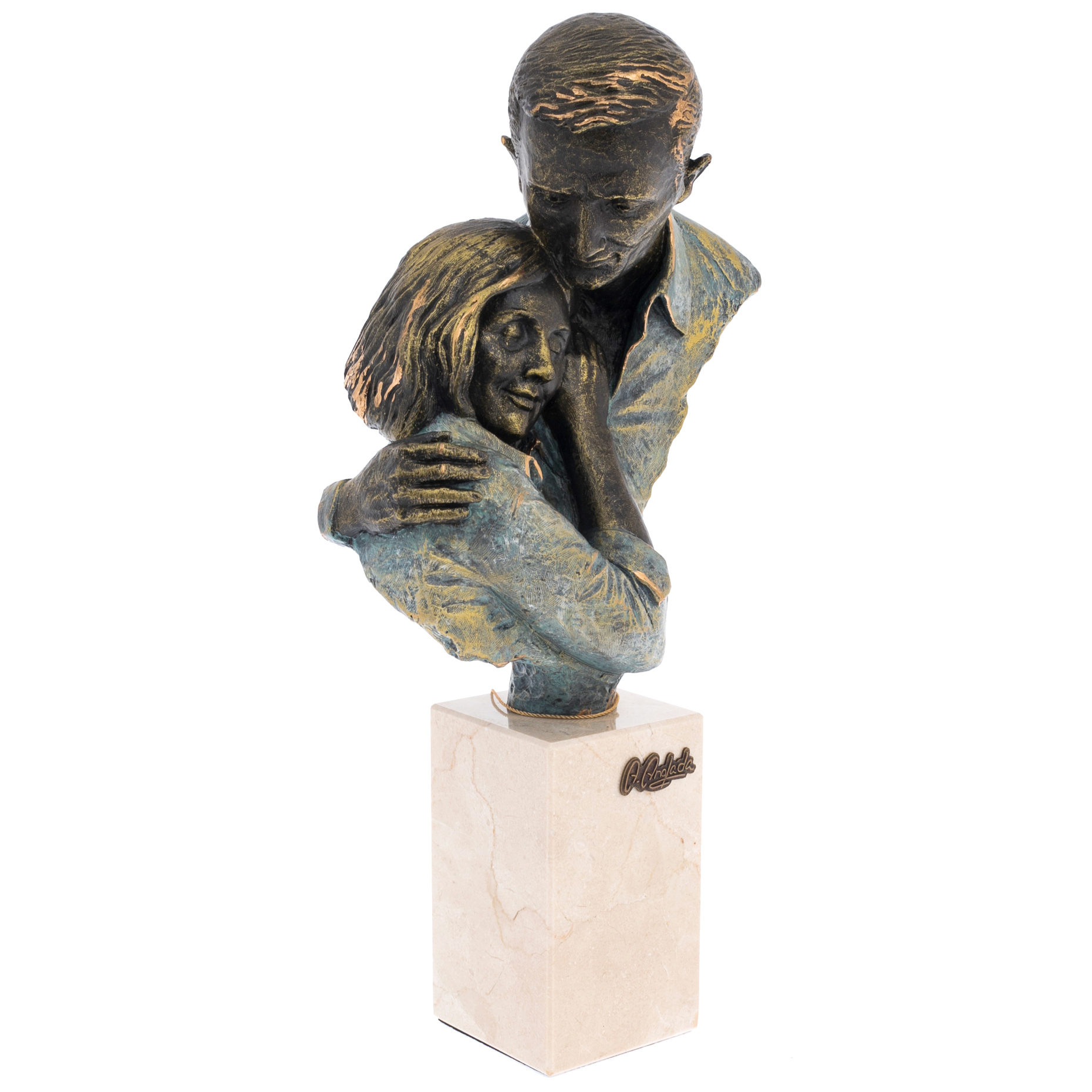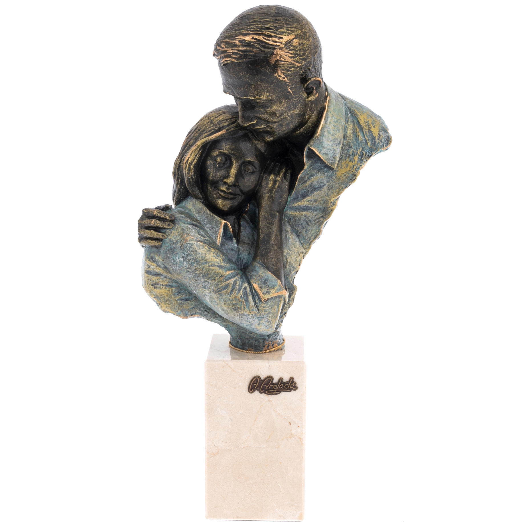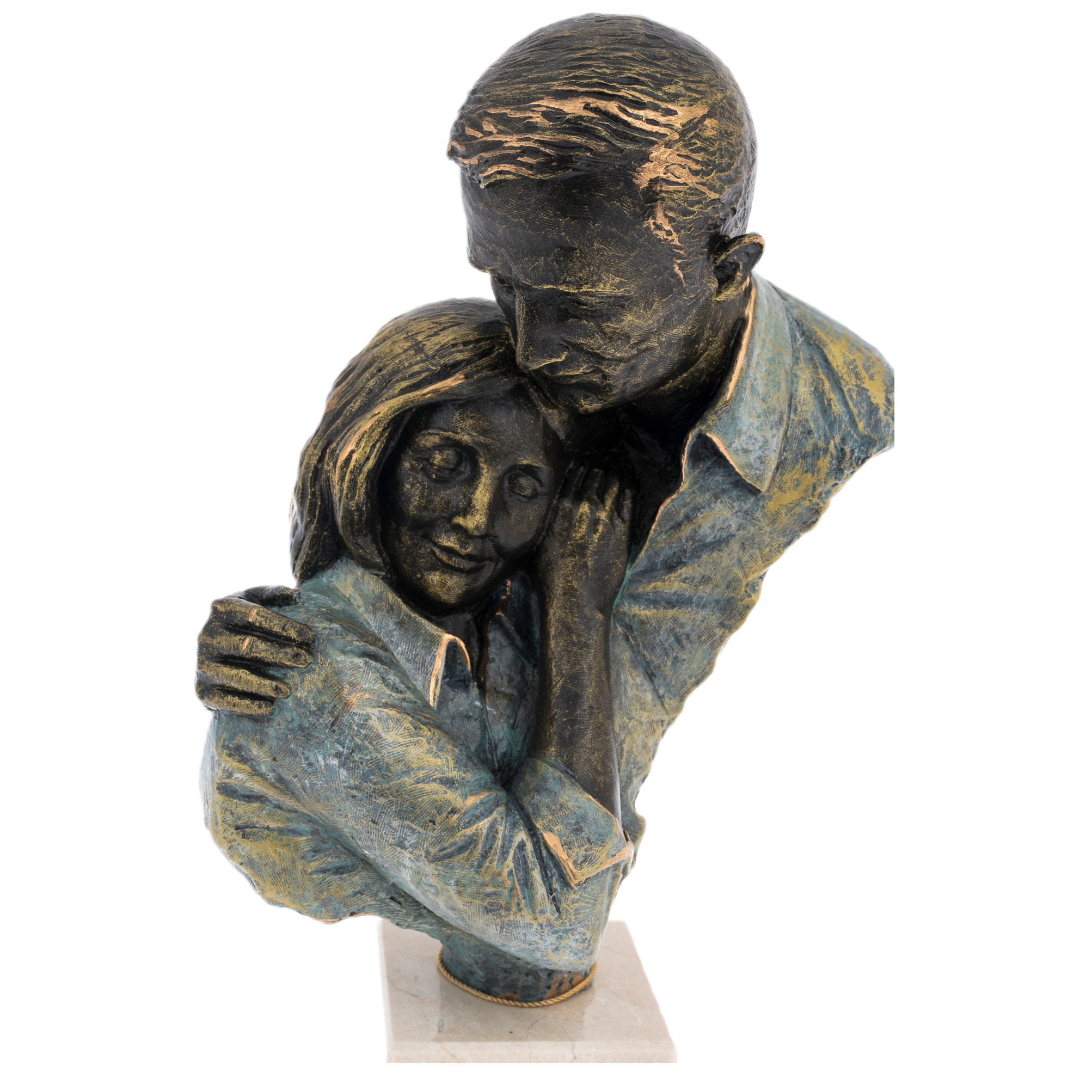 Перед вами — запечатленный в бронзе момент, наполненный тишиной, нежностью и абсолютным доверием. Мужская рука уверенно обнимает женское плечо, а взгляд, устремленный вниз, говорит больше, чем любые слова. В этой скульптуре нет лишних деталей, но есть все: защита, преданность, любовь, не знающая сомнений. Здесь объятие — не просто движение, а язык безмолвной силы, где каждый изгиб металла передает тепло настоящей близости.