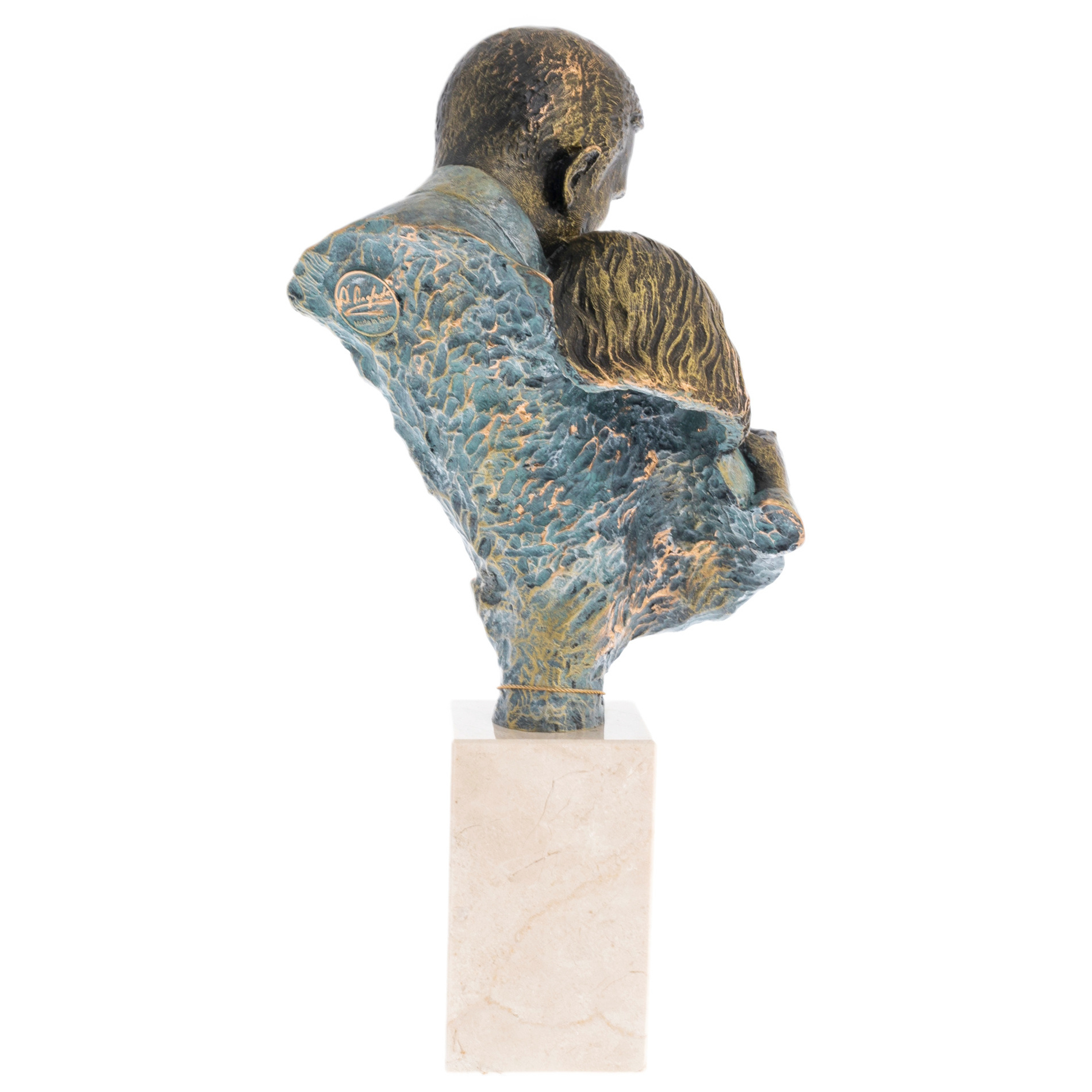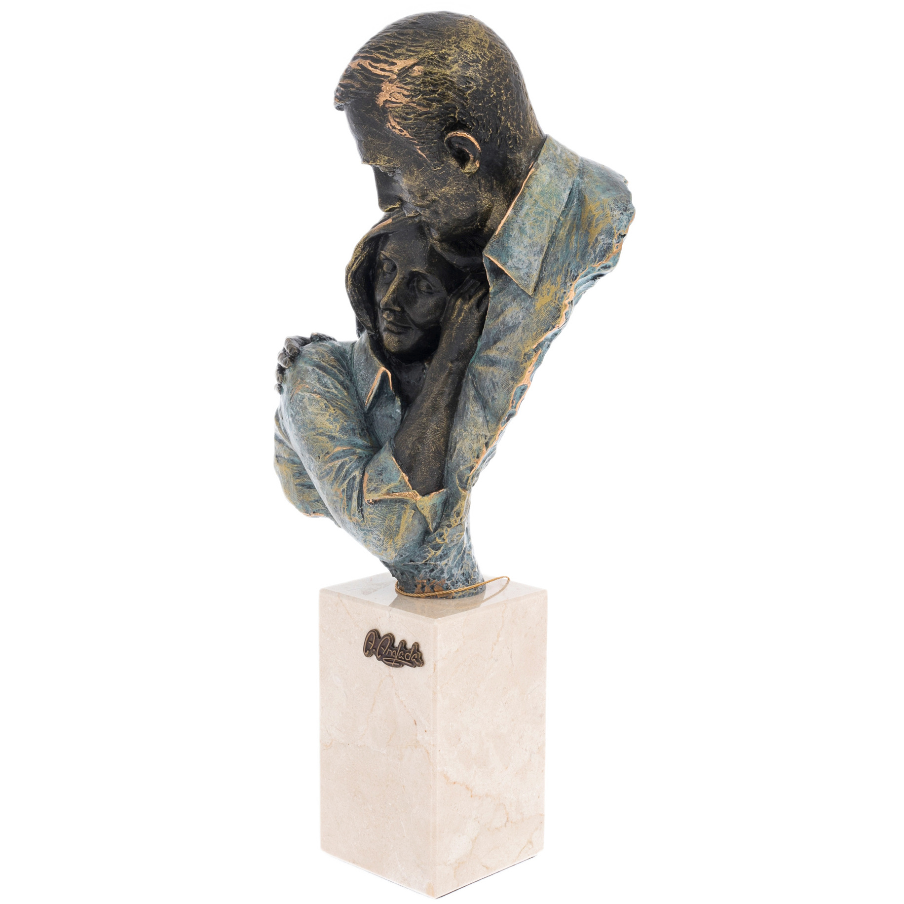 Мраморное основание служит символом стабильности, вечной прочности, на которой держится все — чувства, судьбы, само бытие. Гладкая полированная поверхность вступает в диалог с бронзой, объединяя хрупкость и силу, разум и эмоции. Эта скульптура — не просто предмет искусства, но образ целого мира, в котором любовь — не мимолетное ощущение, а закон, вырезанный в камне.
