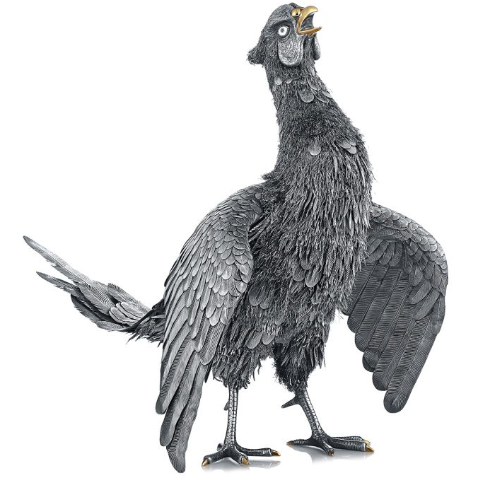 Скульптура выполнена вручную из серебра 925 пробы, весом более 2,5 килограмма, с филигранной проработкой оперения — каждая перышко словно оживает под игрой света. Детали головы, клюва и лап украшены позолотой 24 карат, придающей благородное сияние и подчёркивающей природную красоту этой редкой птицы. Глаза инкрустированы бриллиантами весом 0,146 карата, благодаря чему взгляд фигуры приобретает живость и магнетизм.