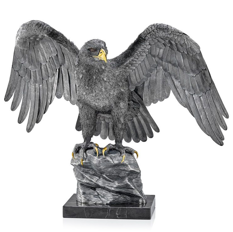 Могучий и величественный орел раскинул крылья над скалистым утесом, воплощая силу духа, прозорливость и неоспоримую власть. Эта внушительная скульптура создана из серебра 925 пробы, установленного на основании из благородного мрамора. Вес изделия — более 8,5 кг, из которых 3454,42 г — чистое серебро.