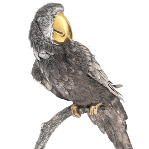 На изящной мраморной подставке, подобно миниатюрной сцене, застыл попугай в момент молчаливого наблюдения. Его стройное тело выполнено из серебра 925 пробы, каждая перышко детально проработано, передавая структуру оперения и мягкий изгиб линий. Клюв и когти покрыты 24-каратной позолотой, подчёркивая экзотический облик, а в глаза инкрустированы бриллианты общим весом 0,386 карата, добавляя взгляду особую живость и выразительность.