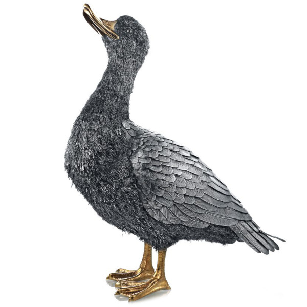 Тело утки искусно выполнено из тёмного патинированного серебра, имитирующего мягкое оперение, с филигранно проработанными перьями на крыльях. Голова, шея и туловище изобилуют мельчайшими деталями, передающими естественную текстуру. Клюв и лапы покрыты чистым золотом, благодаря чему скульптура приобретает нарядный, благородный акцент, подчёркивая её статус подарка премиального уровня.