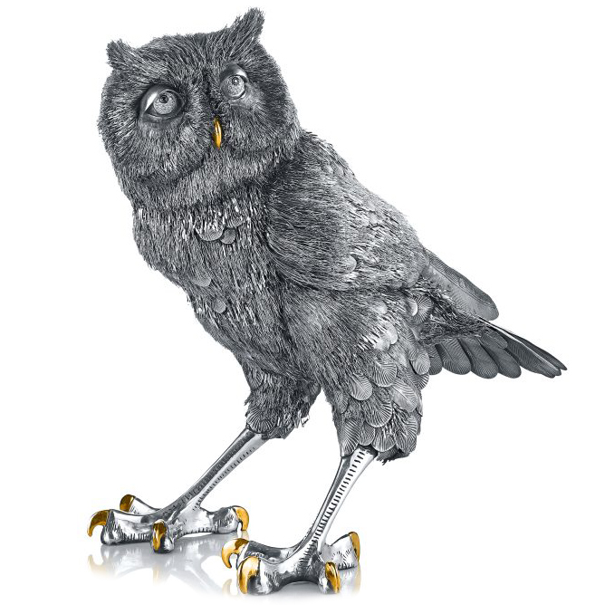 Олицетворение ночной мудрости и невозмутимого наблюдения, эта внушительная серебряная сова завораживает с первого взгляда. Скульптура выполнена из серебра 925 пробы и инкрустирована 73 сверкающими бриллиантами общим весом 0,767 карата. Особое внимание притягивают выразительные глаза, в которых таится интеллектуальный холод и глубина ночи. Когти и клюв, покрытые 24-каратной позолотой, сверкают, словно солнечные отблески в утреннем инейном лесу.