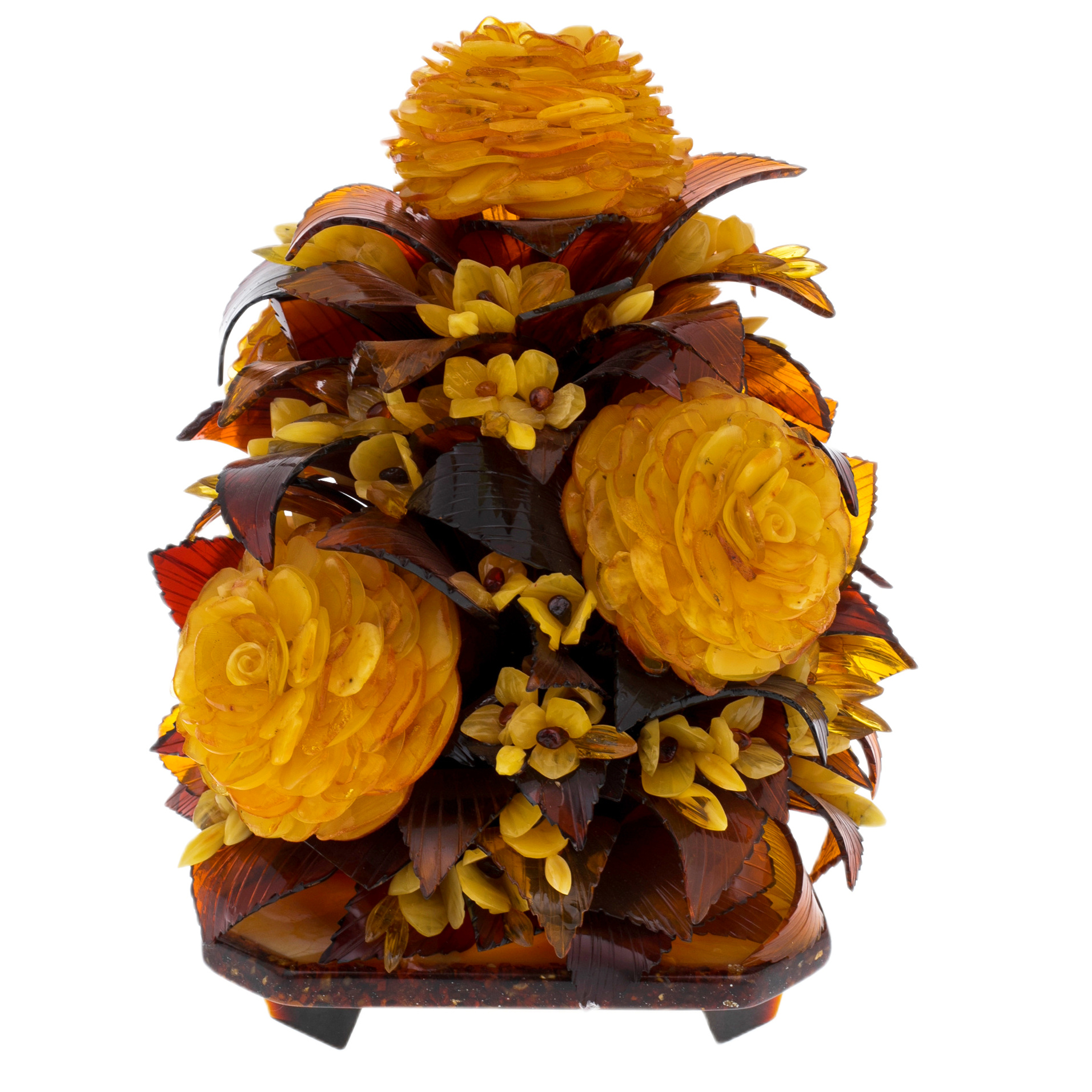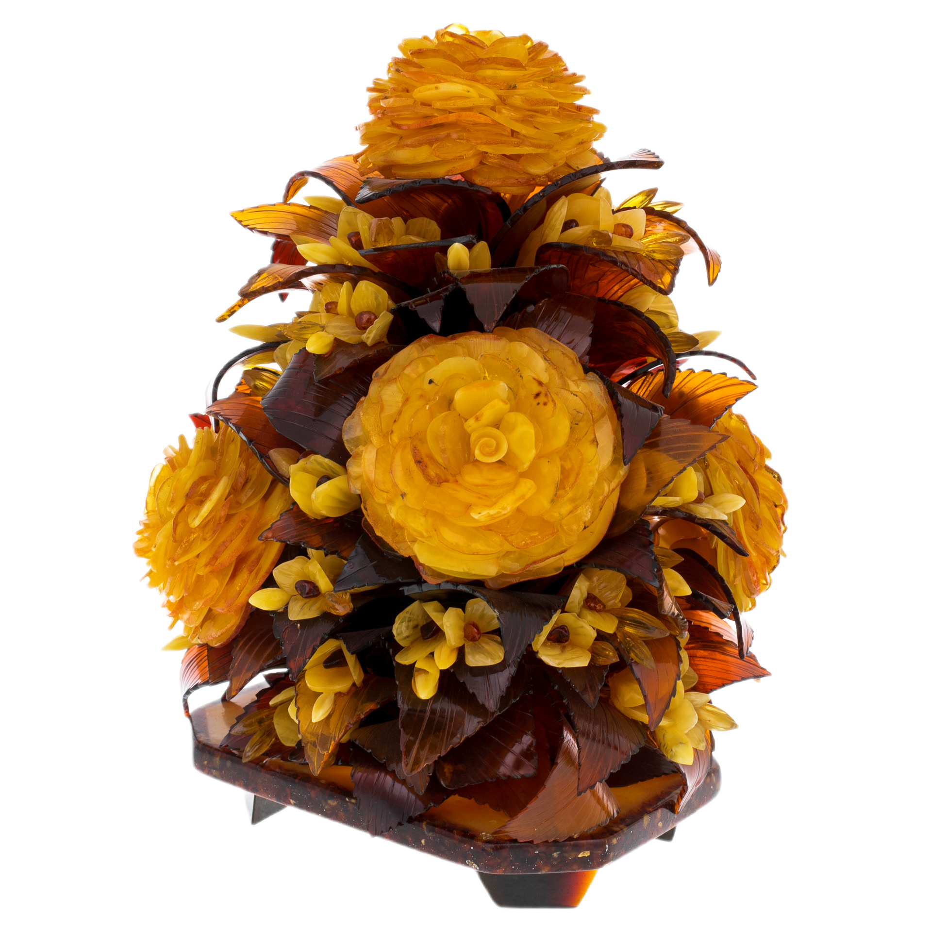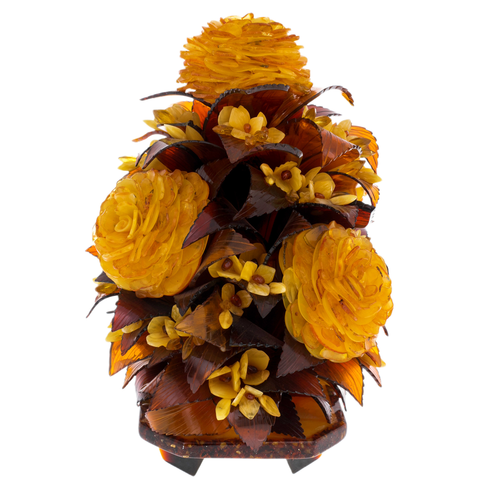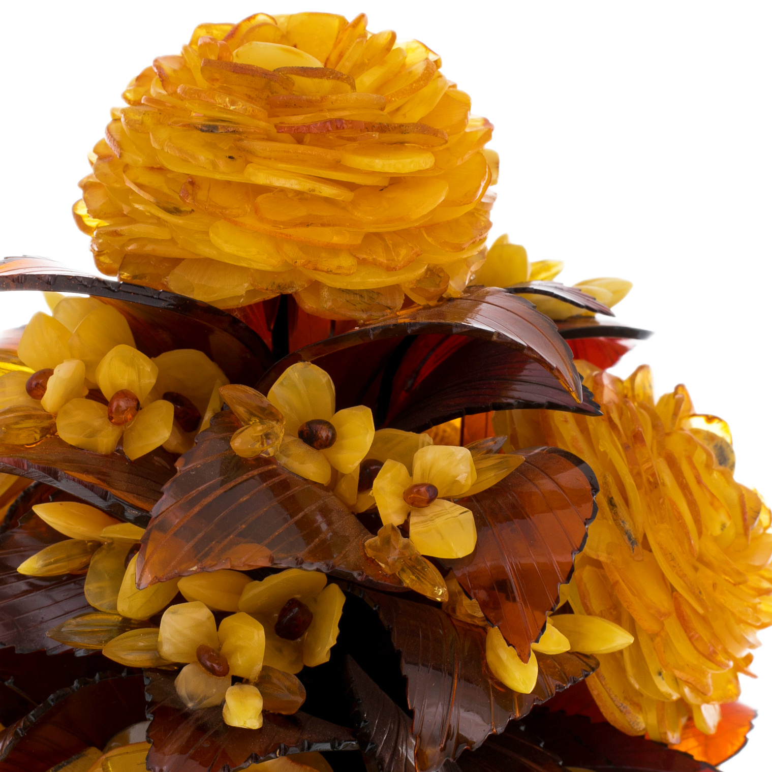 Флористическая композиция выполнена в традициях японского искусства икебаны, где каждая деталь несет символику гармонии и красоты природы. Цветы в янтарном исполнении словно застыли в моменте вечного цветения, становясь воплощением утонченности и постоянства. Богатая цветовая палитра делает икебану особенно выразительной при любом освещении: янтарь оживает в лучах солнца и приобретает благородное сияние при мягком искусственном свете.