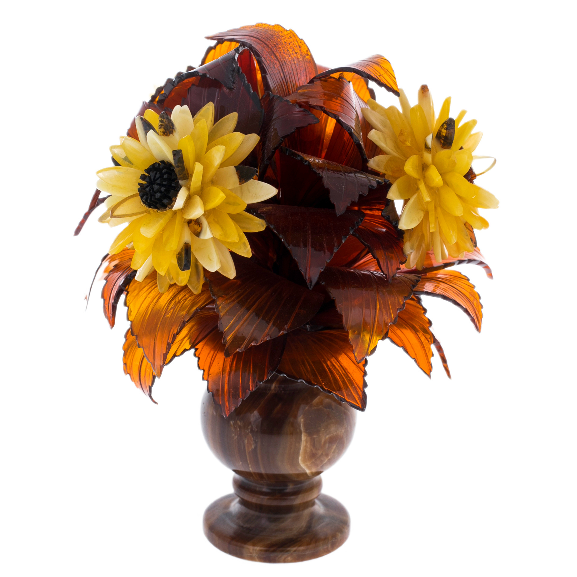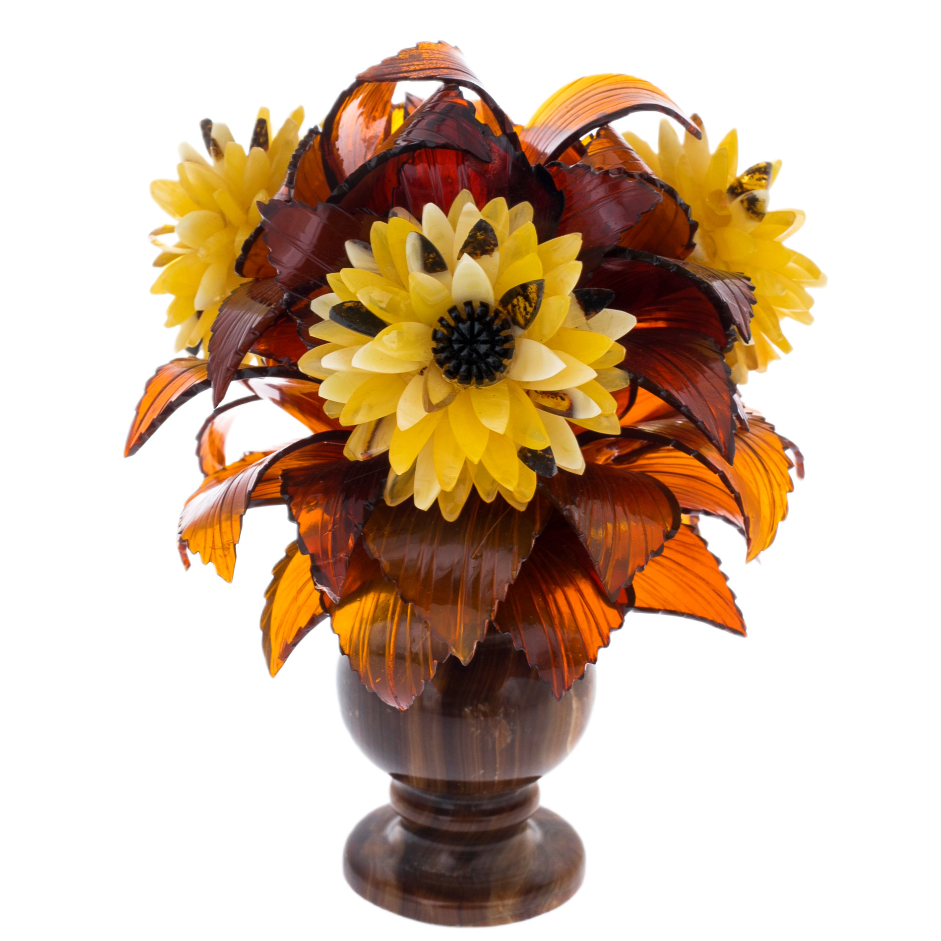 Великолепный букет из натурального янтаря и оникса — это дань вечной красоте, собранной из мгновений. Он как символ времени, застывший в величественной композиции, отражает неизменность природной гармонии и безмолвную силу Земли. Здесь каждый лепесток и каждый цветок — не просто элементы декора, но отдельная история, сотканная из солнечных лучей и землистых оттенков.